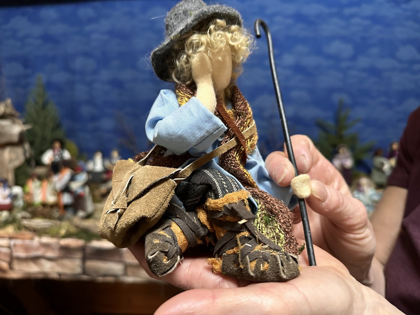 Rita Cavegn näht, strickt und filzt jedes Teil, bis es passt. Ihre Hirten haben Hemden mit Mini-Knöpfen und sogar Kragen. Dazu tragen sie gefilzte Jacken, gestrickte Gilets und die modernsten sogar Knickerbocker mit Schnallen.