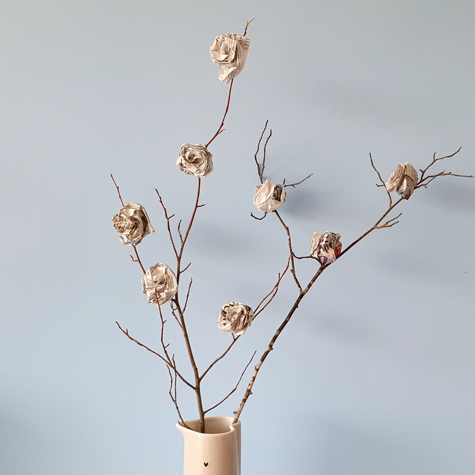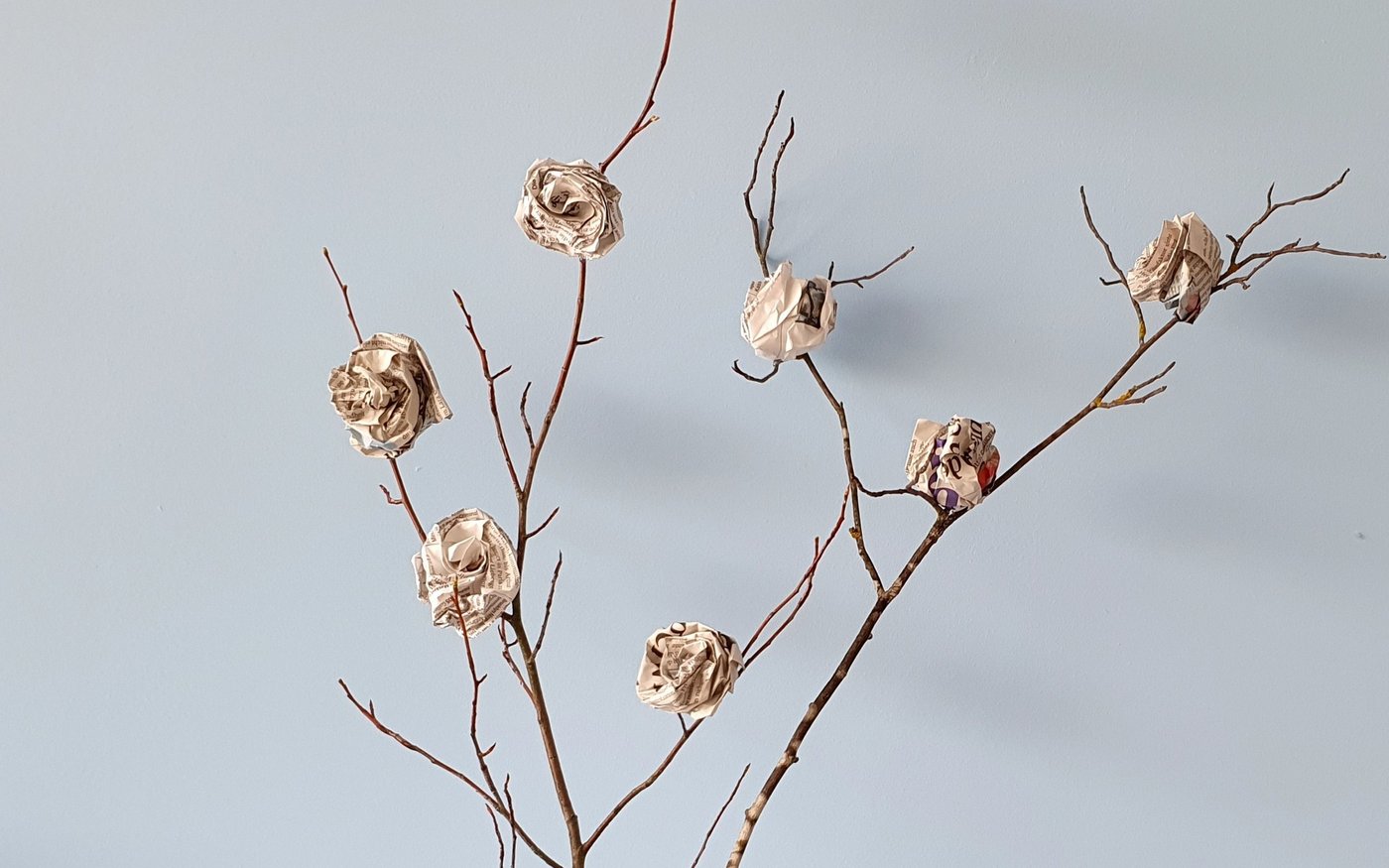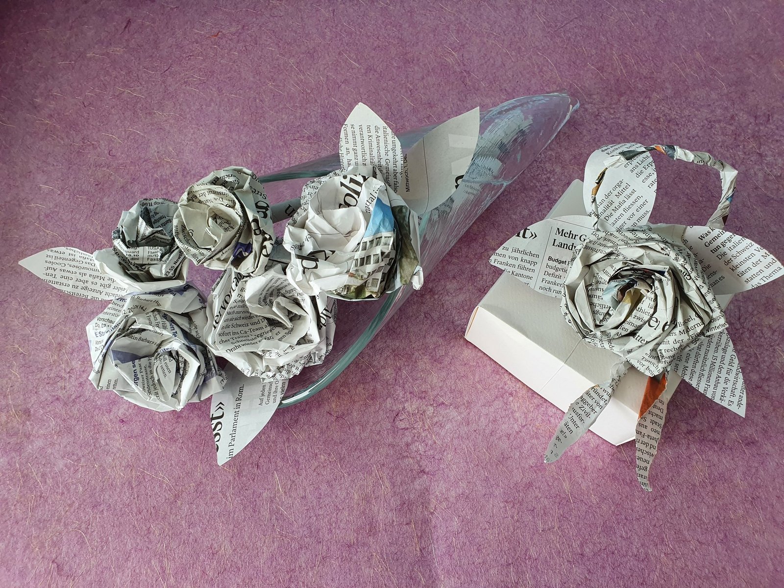 Langstielige Rosen lassen sich als Strauss in einer Vase arrangieren. Mit einem Punkt Heissleim fixiert, blühen die Rosen sogar auf getrockneten Zweigen weiter. Wer es farbiger mag, malt die Zeitungsseiten zuallererst mit Pinsel und Farbe an – lasierend oder deckend –, beides hat seinen Reiz.