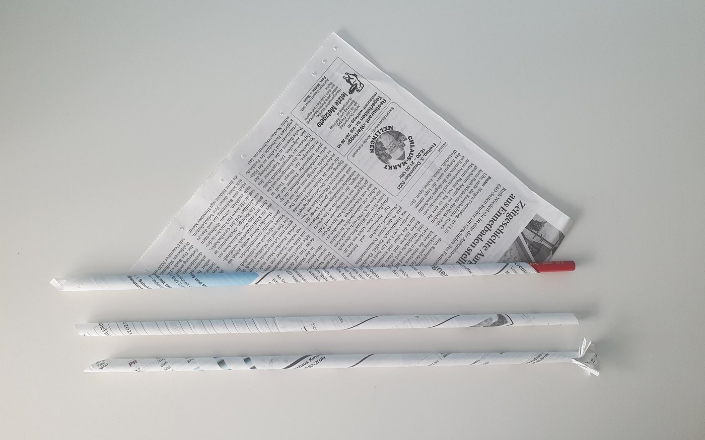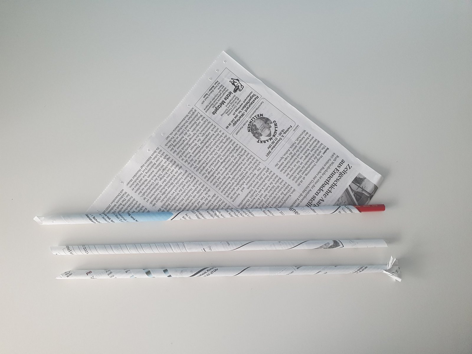 Zum Schluss wird die letzte Zeitungsecke mit Weissleim fixiert und der Bleistift rausgezogen. Das Ende wird gerade abgeschnitten und mehrmals eingeschnitten, damit der Stiel an die Rose geklebt werden kann.