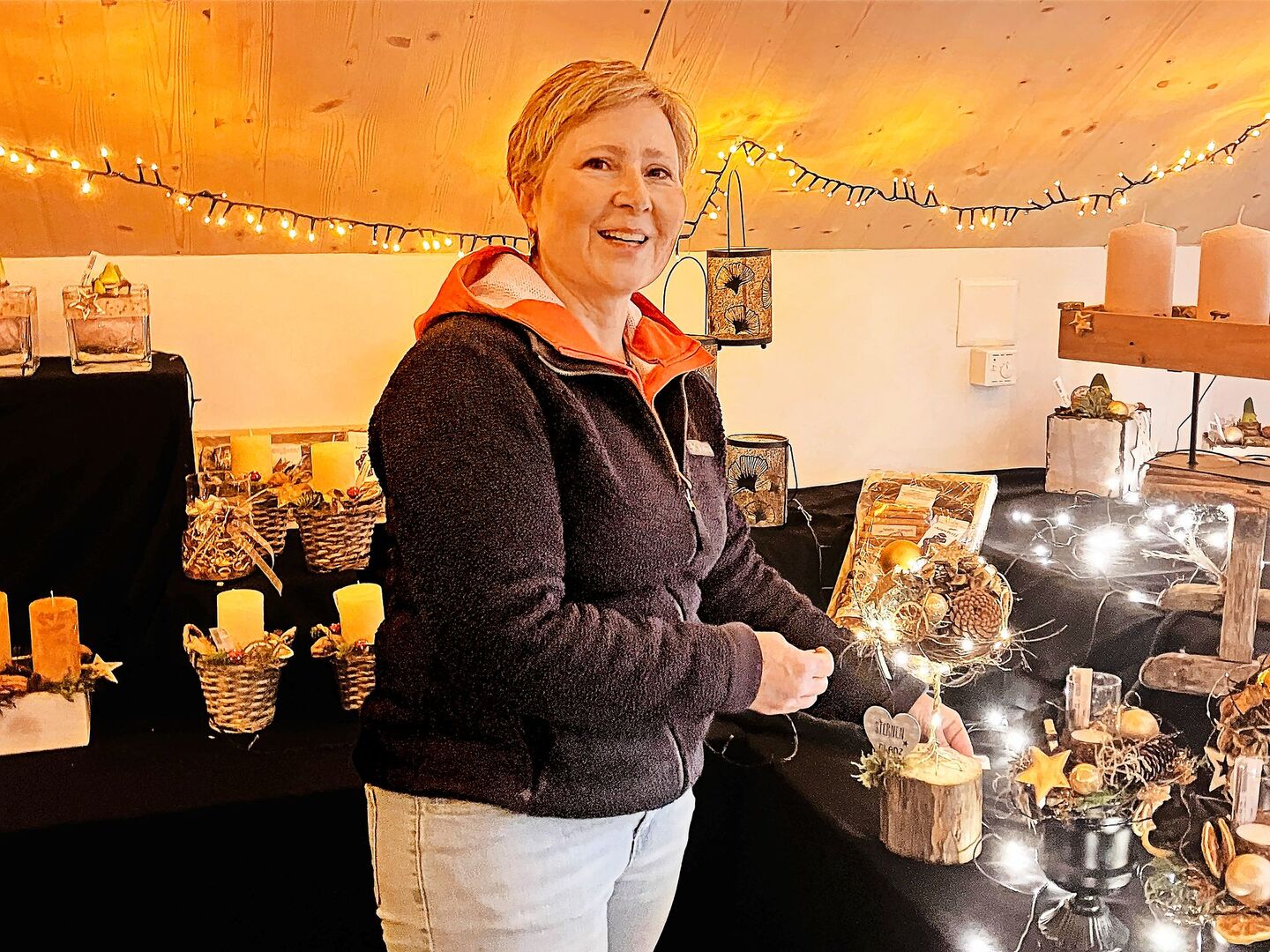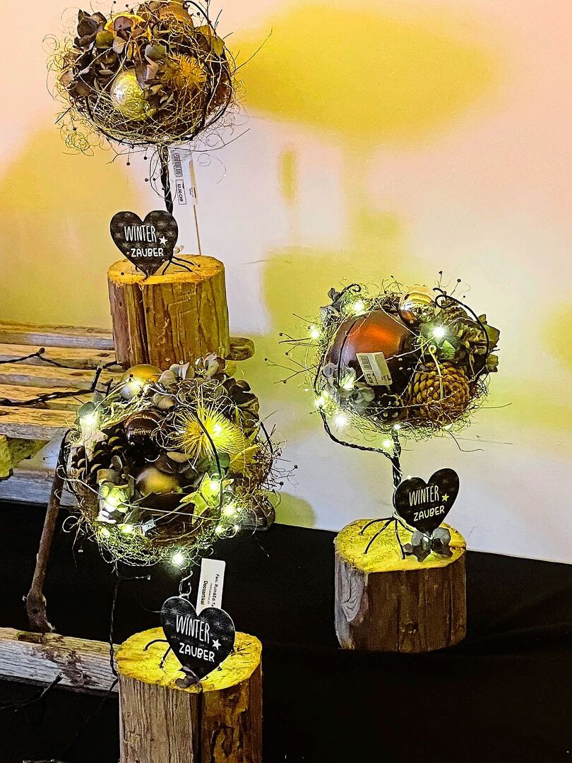 Ruth Tanner stellt das Adventsbäumchen hin, sie ist fast fertig mit den Vorbereitungen. Ihr liegt viel am jährlichen Adventsmarkt. «Da bin ich mit Herzblut dabei», erzählt sie und zeigt das geschmückte Verkaufslokal. In dem Raum blinkt und glitzert es, die Blumendekorationen sind arrangiert, dazwischen Gruppen von Biberchläusen und Drahtengeln. «Es läuft jedes Jahr gleich ab», sagt Ruth Tanner lachend. «Wenn die Ausstellung begonnen hat und die ersten Kunden da sind, wird es richtig schön.»