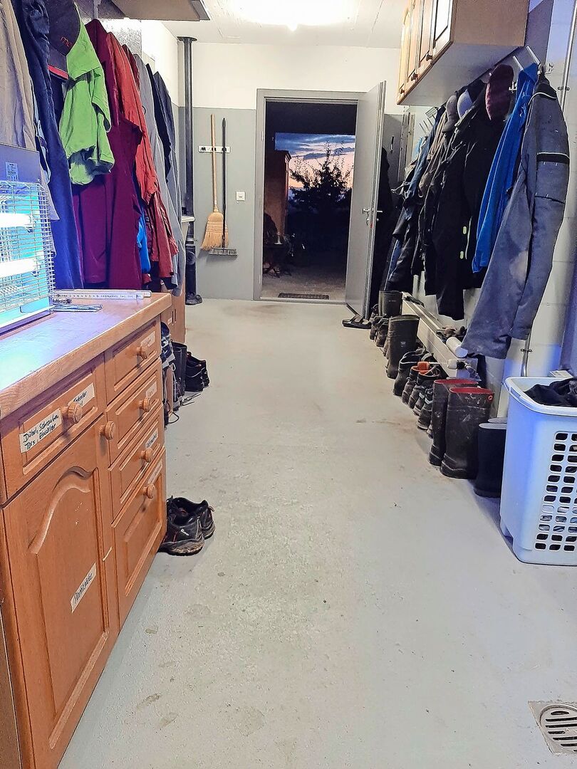 Der Raum sollte so gebaut sein, dass Kleider gut trocknen. Bei uns steht im Nassraum die Holzfeuerung – dadurch trocknen nasse Kleider auch im Winter sehr schnell. Schmutz hat man in diesem Raum sowieso viel, da stört der Staub der Heizung kaum. Wir haben daneben noch eine saubere Waschküche, dort trocknet es schlechter, aber mit einem Entfeuchtungsgerät geht es. In diesem Raum verstauen wir die sauberen Stallkleider in einem Schrank. Im Nassraum hängen nur getragene Kleider. Beide Räume haben Bodenabläufe.