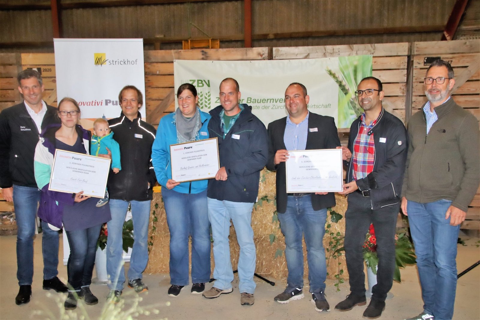 Am frühen Nachmittag, nachdem leichter Regen eingesetzt hatte, wurde der kleine Festakt im Stall Höfli der Familie Weidmann durchgeführt. Erstmals wurde der mit je 5000 Franken dotierte Zürcher Puurepreis an drei innovative Betriebe verliehen. Im Kanton Zürich wird mit dem Projekt «Innovativi Puure» seit einigen Jahren die Innovation in der Landwirtschaft gezielt gefördert und jetzt auch ausgezeichnet. Sechs Projektteams schafften es ins grosse Finale am Sonntag. Die Auswahl wurde von einer breit abgestützten sechsköpfigen Fachjury vorgenommen.