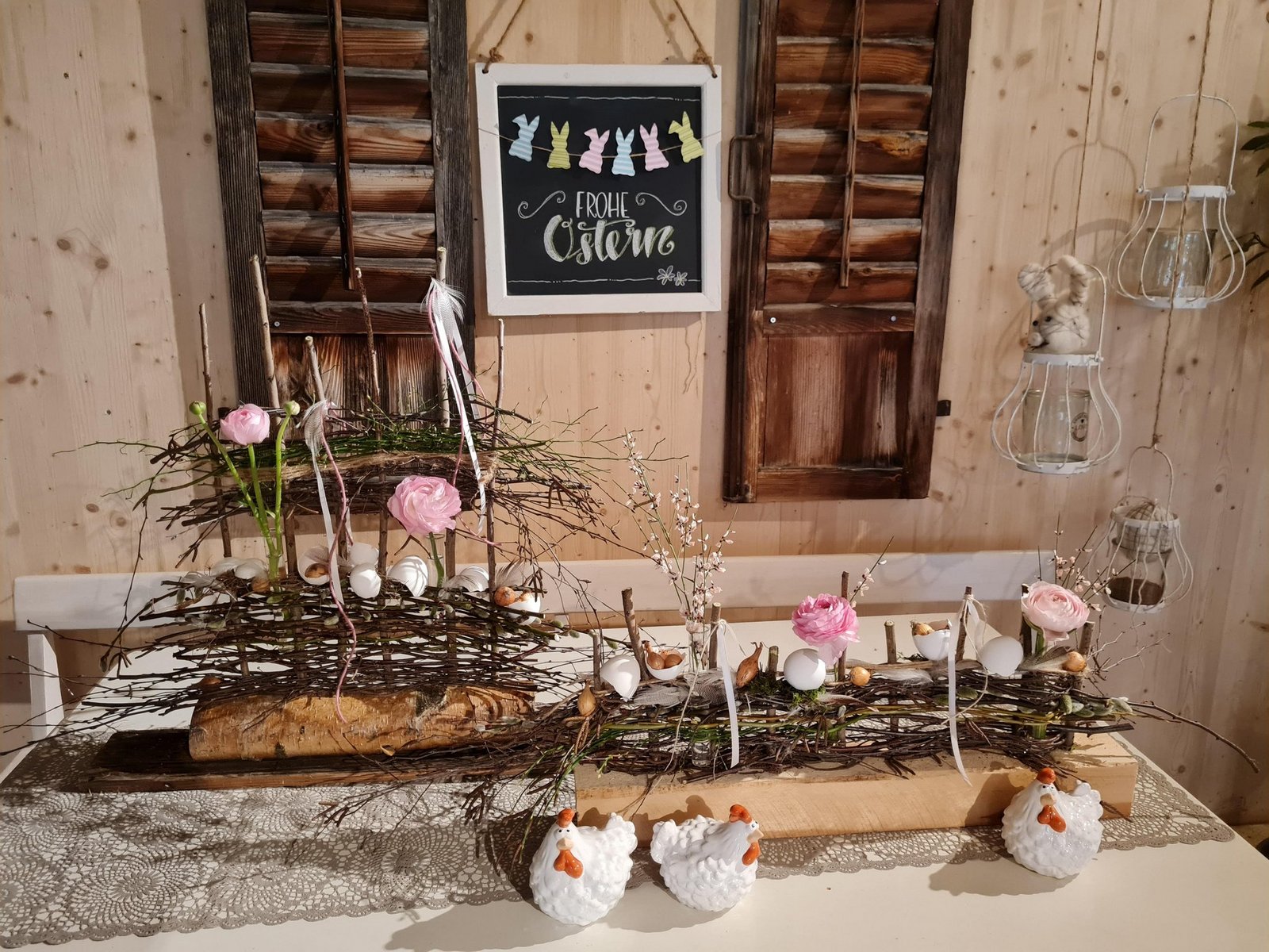 Für ein Ostergesteck werden diese Materialien gebraucht: Bohrmaschine, Baumschere, Schnur, Heissleim, Birkenast oder Doppellatte, Haselzweige, verschiedene weitere Zweige (Birken, Weiden, Efeu), Reagenzgläser, aufgeschlagene Eierschalen, Steckzwiebeln, Federn und frühlingsblühende Blumen. Möchte man das Gesteck als Tischdekoration verwenden, ist es wichtig, dass es nicht zu hoch wird.Franziska Jurt