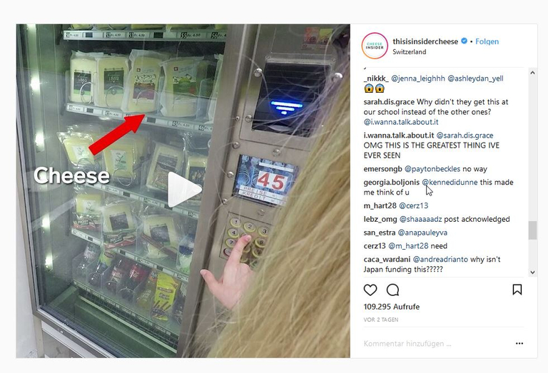 Die Kommentar-Schreiber scheinen begeistert: "Warum gibts hier nicht so nen Automaten, ich würde durchdrehen" oder "It's a dream come true" schreiben die internationalen Käse-Liebhaberinnen und -liebhaber auf Instagram.
