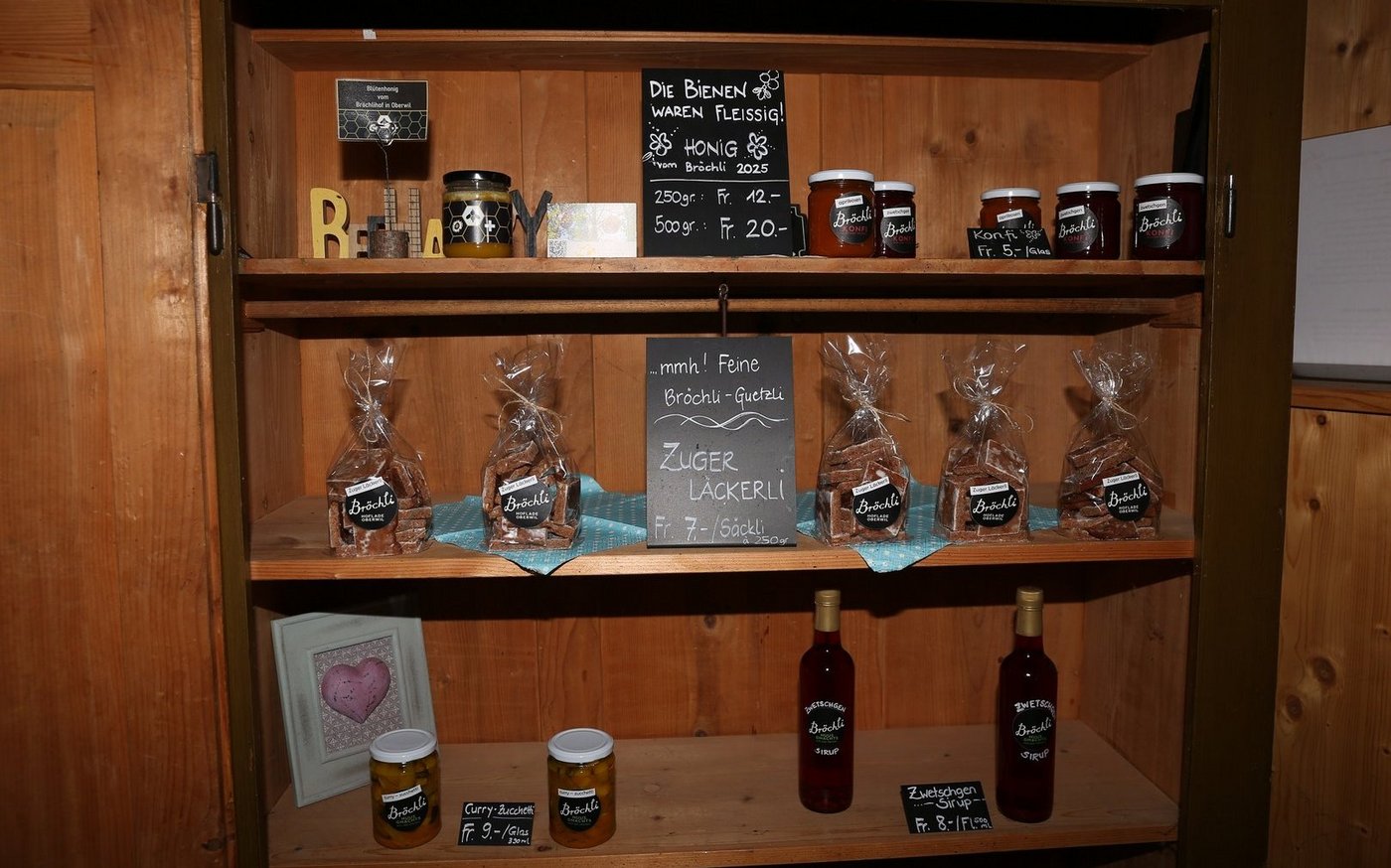Die Eltern von Franz Iten übernahmen den Hof Bröchli, ein Pachtbetrieb der Stadt Zug, im Jahr 1981. Seine Mutter habe lange Jahre einen kleinen und bedienten Hofladen geführt. Als Franz Iten die Pacht 2005 übernahm, stellte er wegen der langen Präsenzzeiten auf Selbstbedienung um. Als dann 2009 nach der Heirat seine Frau Andrea Iten-Lingg auf den Hof kam, wurde die Direktvermarktung ausgebaut und professionalisiert. Im Gebäude, wo sich früher Waschküche und Rossstall befanden, wurden eine Verarbeitungsküche und ein Kühlraum erstellt. Das Angebot wurde laufend ausgebaut. Heute finden Kunden hofeigene Produkte wie Milch und Most, beides aus dem Automaten, Obst, Honig, Eier, Sirup und Selbstgebackenes im heimeligen Verkaufsraum. Ergänzt wird das Sortiment mit Käse und saisonalen Produkten wie Beeren von anderen Höfen. Dank ihrer für diesen Betriebszweig perfekten Lage läuft der Hofladen auch ohne grosses Marketing. Einzig über Facebook und eine WhatsApp Broadcast mit 250 Kunden wird auf aktuelle Angebote aufmerksam gemacht.