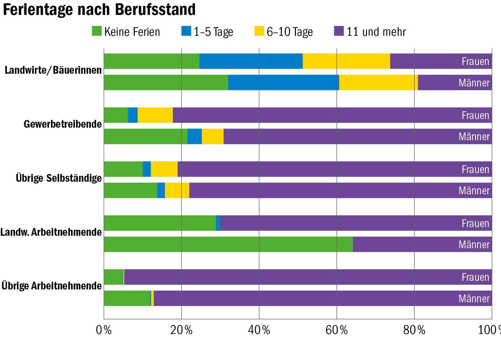 Durchschnittlich bezogen die Landwirte knapp neun Tage und die Bäuerinnen sieben Tage Ferien pro Jahr. Verglichen mit den anderen Gruppen ist das sehr wenig, wie es im aktuellen Agrarbericht heisst. Gewerbetreibende Männer machten im Schnitt 21 Tage Ferien pro Jahr, Gewerbetreibende Frauen 17 Tage. Für Bauernfamilien, insbesondere für jene mit Nutzvieh, ist es aufwendig, vom Betrieb vorübergehend wegzugehen. 24 % der Landwirte bzw. 30 % der Bäuerinnen hatten gar keine Ferien.