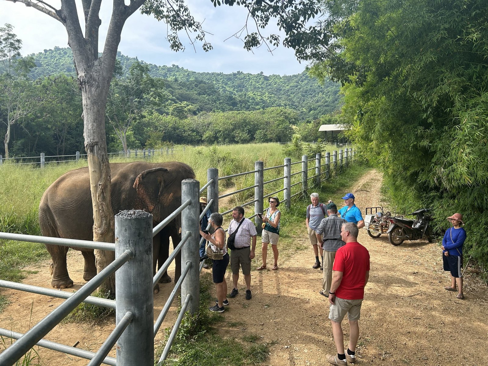 Auf unserem letzten Ausflug, nicht weit von Hua Hin, besuchen wir ein Weingebiet, das Elefantenfütterung als Attraktion für Touristen anbietet. Während der Führung, bei der wir mit einem Golfmobil durch das Gebiet fahren, bekommen wir die Gelegenheit, die Reben aus der Nähe anzuschauen. [IMG 21]