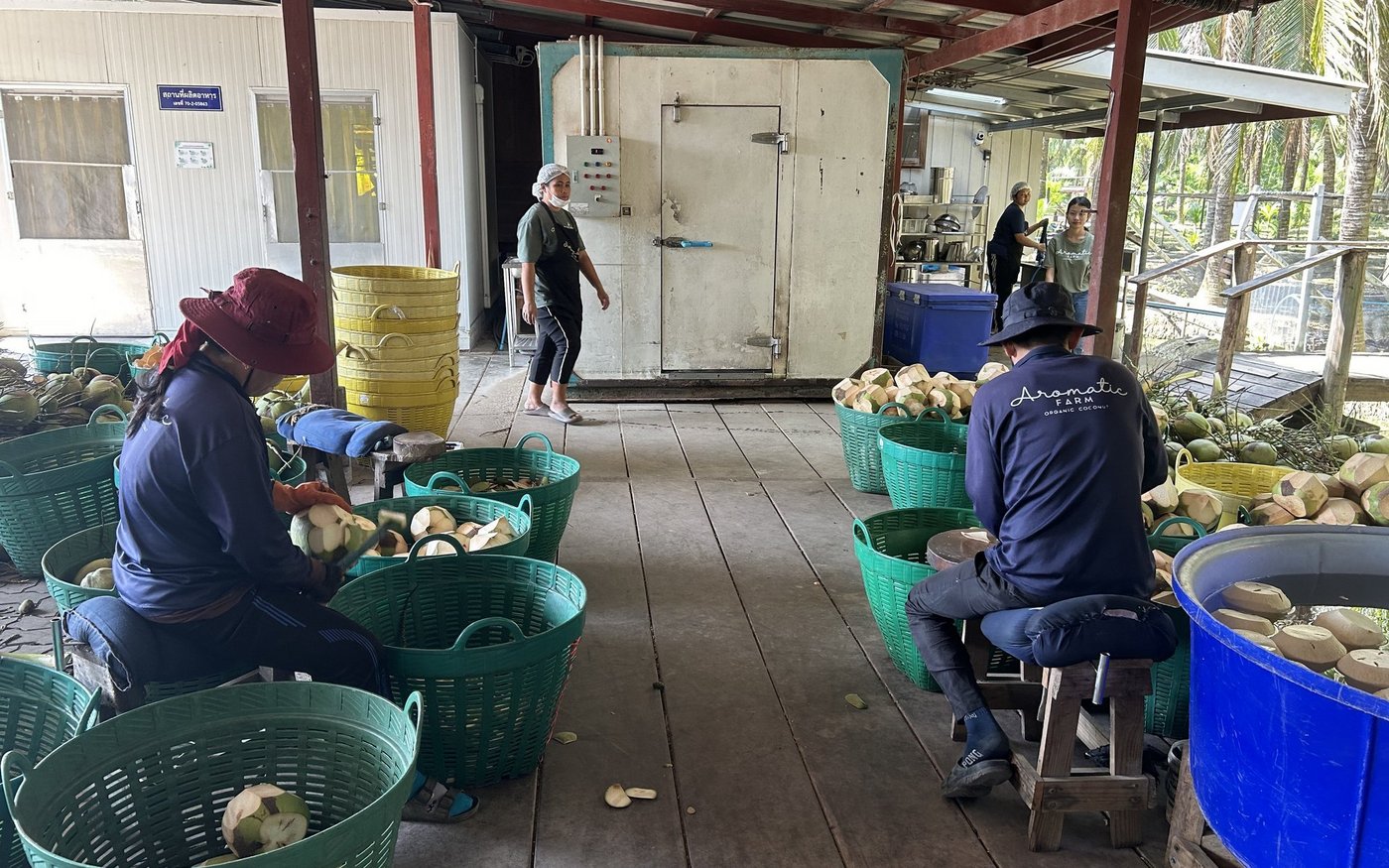 [IMG 17-18] Die geernteten Früchte, werden geschält, um sie dann in Folie zu packen, mit dem Logo des Unternehmens zu versehen und zu verkaufen. An der Arbeit und dem Erfolg seien mehrere Familien aus der Region beteiligt, erklärt uns die Leiterin des Unternehmens. So können die Familien auf ein sicheres Einkommen vertrauen und sich auf der Farm ausbilden. Der Nachhaltigkeit hat bei der Kokosnussfarm einen grossen Stellenwert, so wird zum Beispiel der Produktionsabfall zu 97% recycelt.
