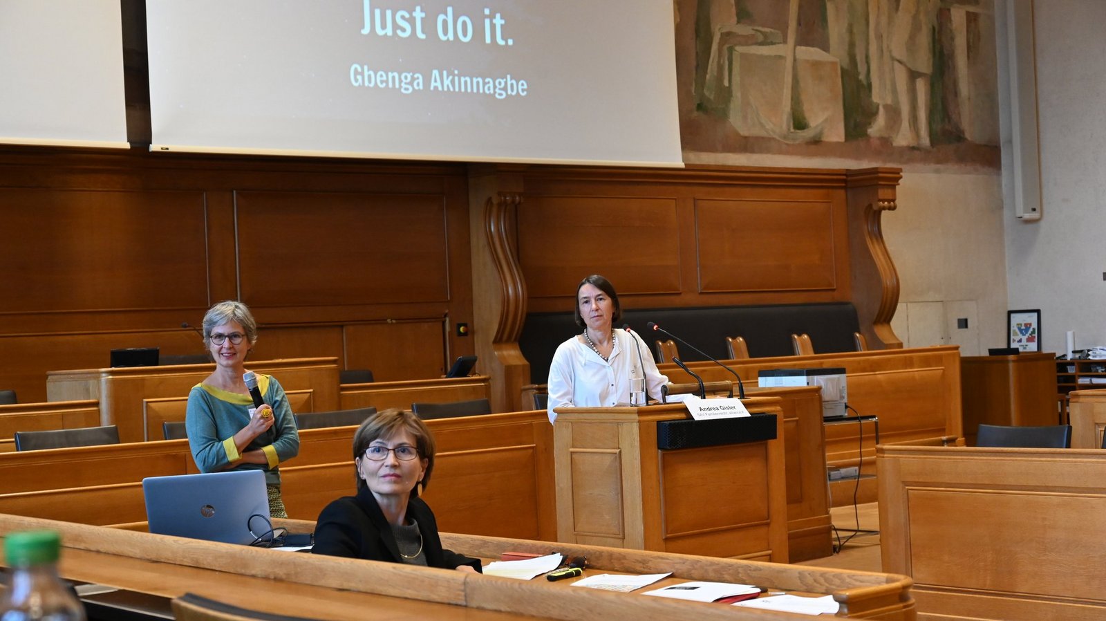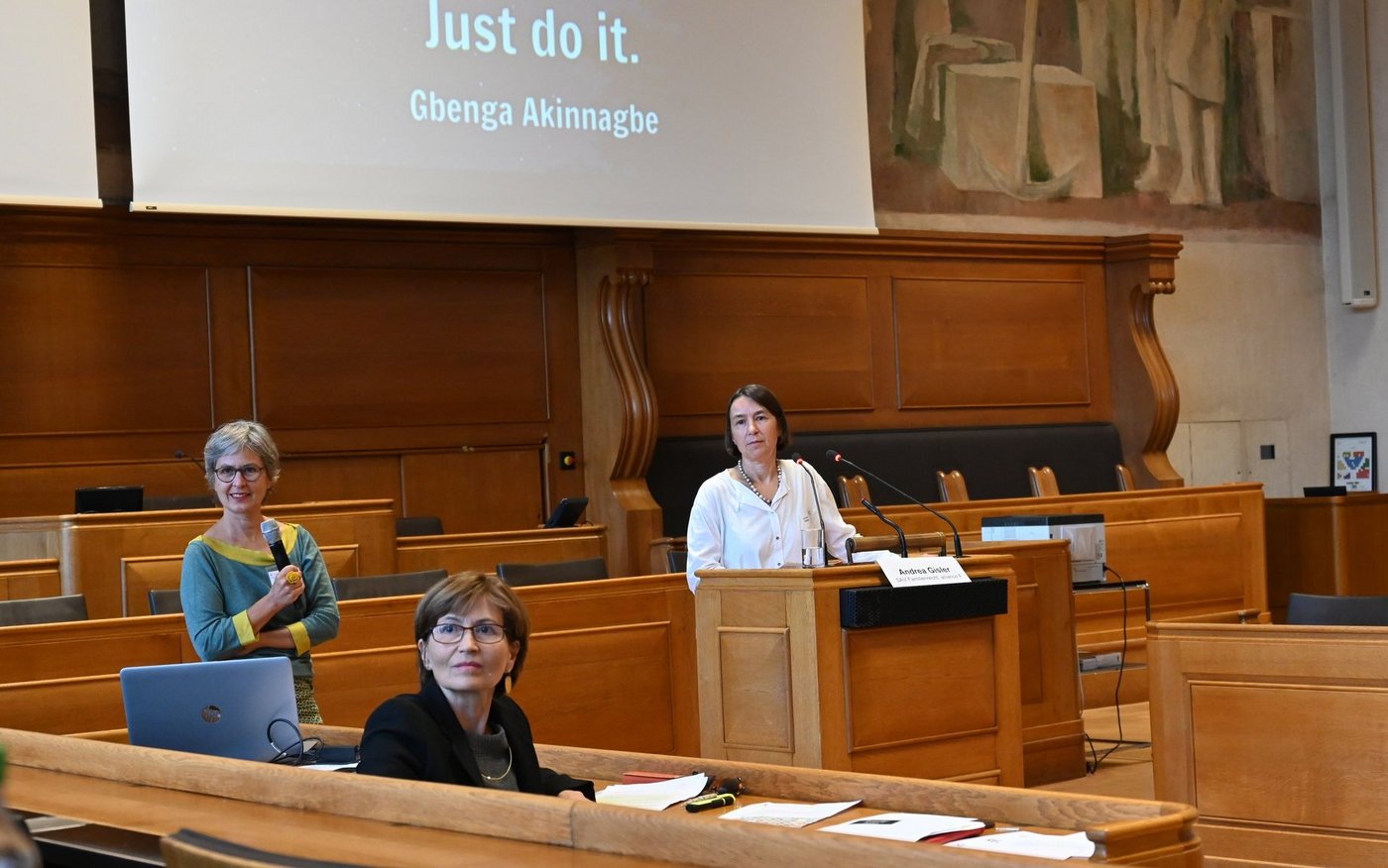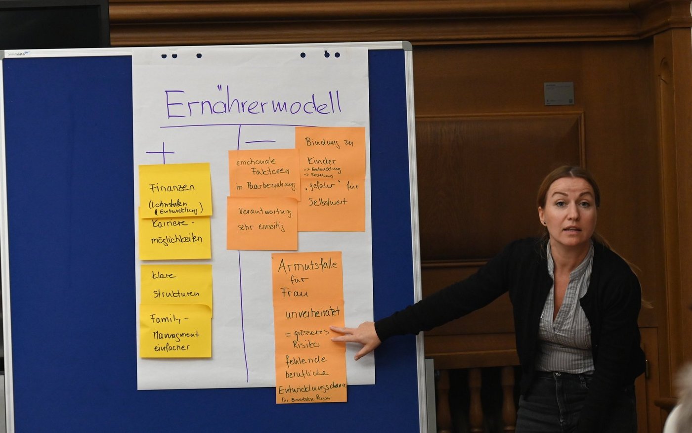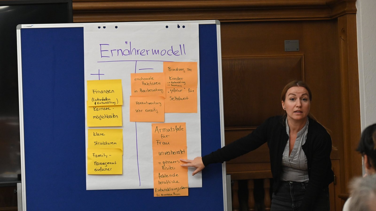 Bevor die Teilnehmenden sich zu den Workshops begeben, die alle ein unterschiedliches Thema in der gesamten Thematik eingehend beleuchten, hält Andrea Gisler ein Referat. Gisler ist Rechtsanwältin und Fachanwältin SAV Familienrecht sowie Vorstandsmitglied von Alliance F, der Bund Schweizerischer Frauenorganisationen. Anhand Statistiken zeigt sie auf, dass von Armut meist alleinstehende ältere Frauen oder alleinerziehende Frauen betroffen sind. Schuld daran sind unter anderem die fehlenden sozialen Absicherungen vieler Frauen, wenn sie ihre Erwerbstätigkeit für die Familien- und Hausarbeit aufgeben oder nur in einem kleinen Pensum beibehalten. Zum Problem wird dies insbesondere bei einer Scheidung oder bei im Konkubinat lebenden Frauen, bei einer Trennung.