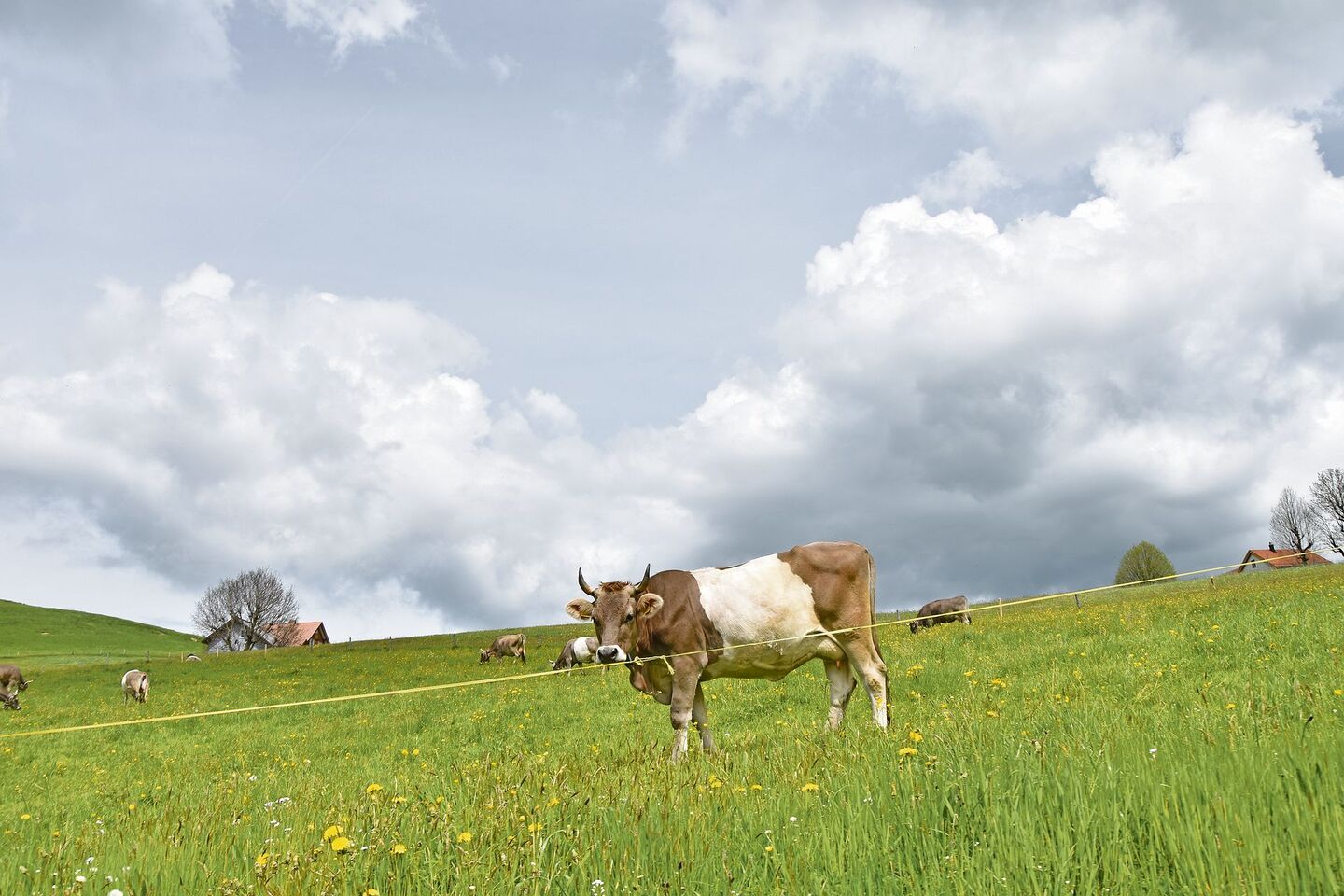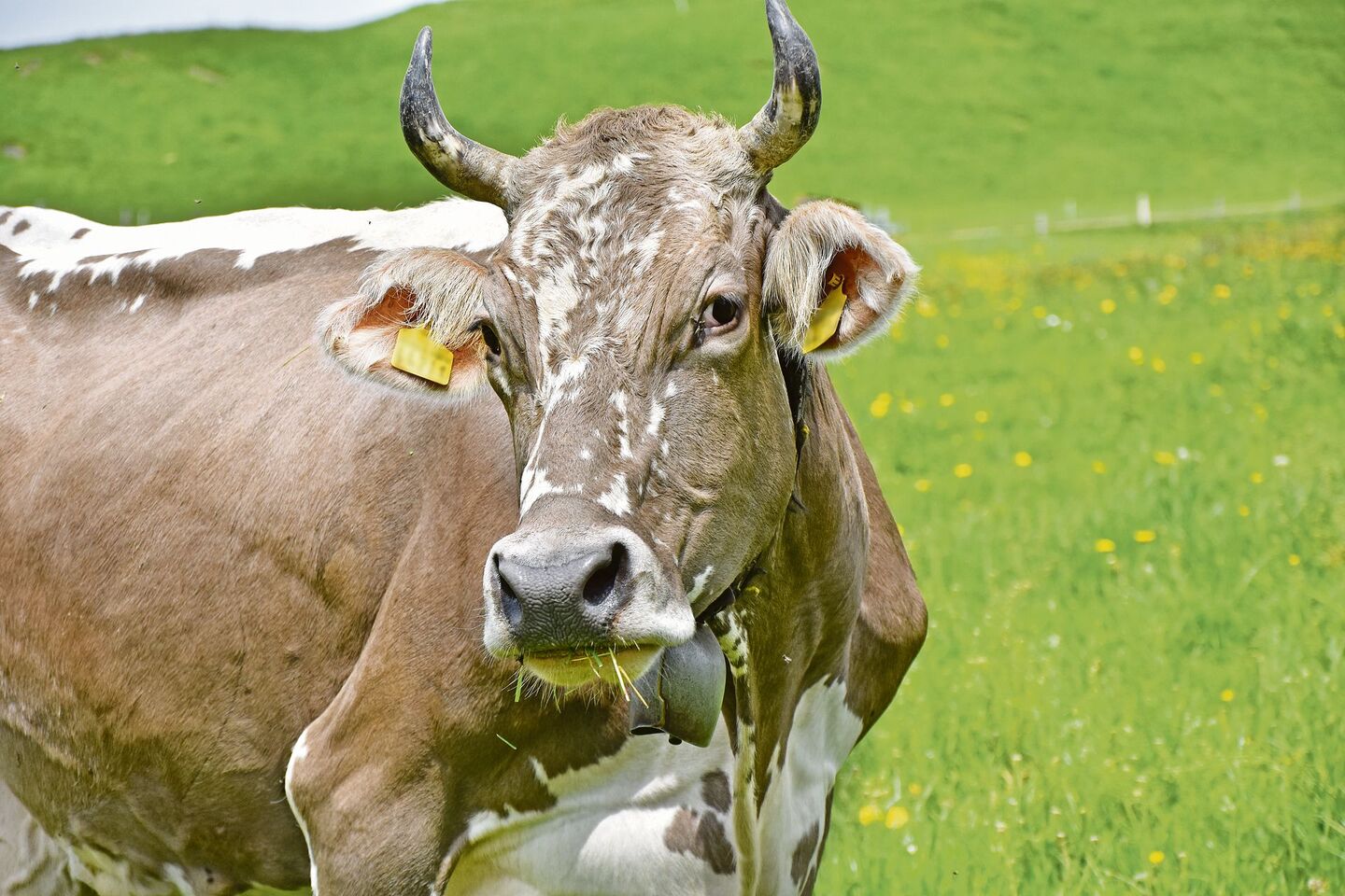 [IMG 3] Blüem oder Gurt werden die Rassen genannt, deren Tiere weisse Musterungen am Kopf, einen Strich auf dem Rücken oder weisse Fellfärbungen wie einen Gürtel, der sich um den Bauch zieht, haben. Lange waren sie vom Aussterben bedroht, mittler-weile setzen wieder mehr Bauern auf die seltene, alte Rasse.