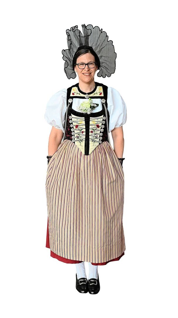 Regula Kobel aus Busswil bei Melchnau ist bei der Bernischen Trachtenvereinigung die Leiterin der Fachgruppe Kinder und Jugend. Sie trägt eine Müngertracht. «Ich hatte das grosse Glück diese Tracht in einem Kurs selbst nähen zu können», erzählt sie. Die Haube hat sie jedoch geerbt. Das Vorgängermodell der Tracht war ein Geschenk ihrer Mutter und stammte aus einer Börse.[IMG 4]