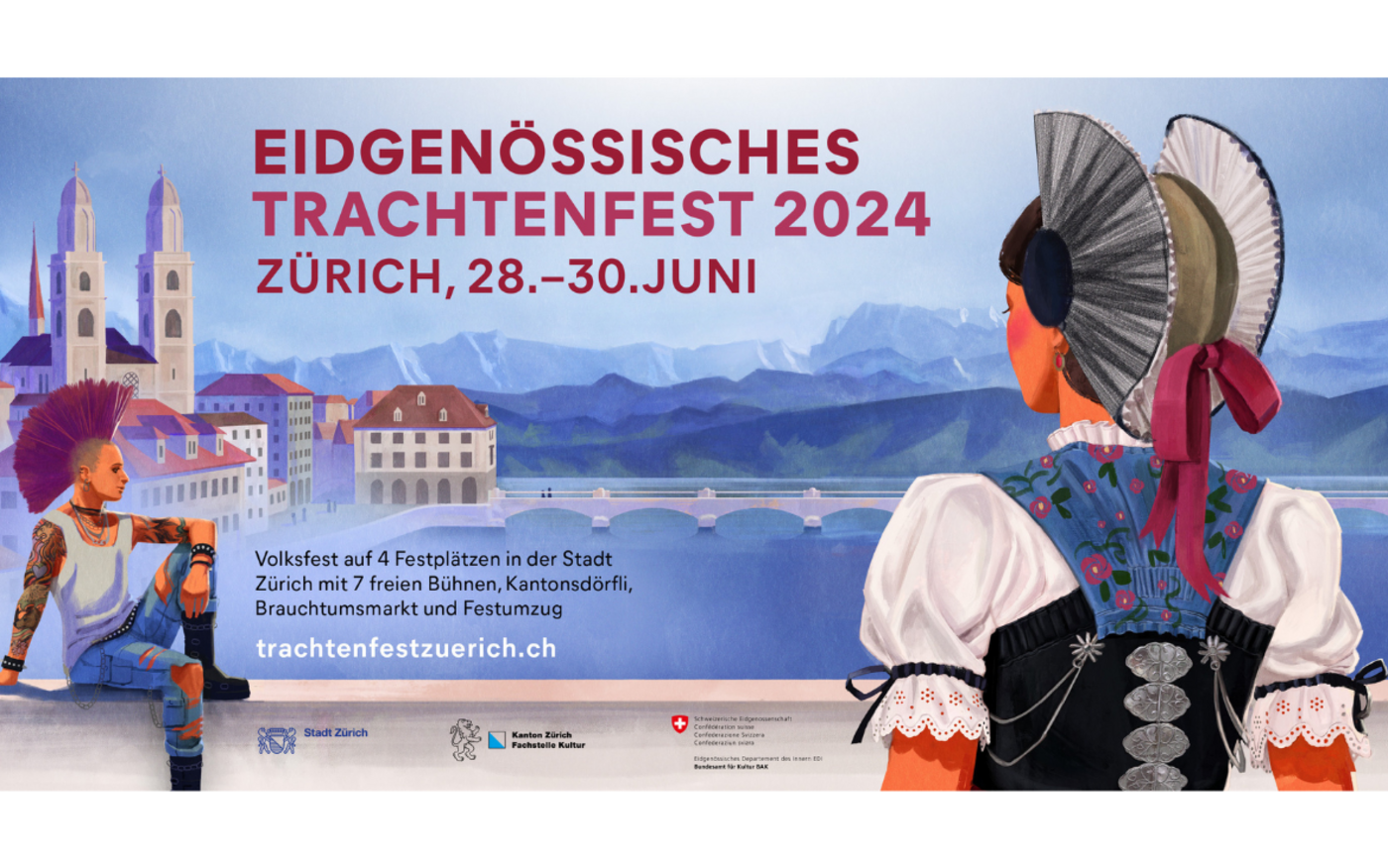 Wie Zürich im Verlauf jedes Jahres mit verschiedenen Events vereint auch das Festplakat des Eidgenössischen Trachtenfestes kulturelle Gegensätze: Es zeigt eine Trachtenfrau aus dem Kanton Appenzell Innerrhoden in der Werktagstracht, die auf die Stadt Zürich blickt. Die Schwarze Flügelhaube auf ihrem Kopf spiegelt sich im Irokesenhaarschnitts des tätowierten Punks, der links im Bild auf einer Mauer sitzt. Er soll für eine weltoffene Stadt stehen, die Diversität zulässt.