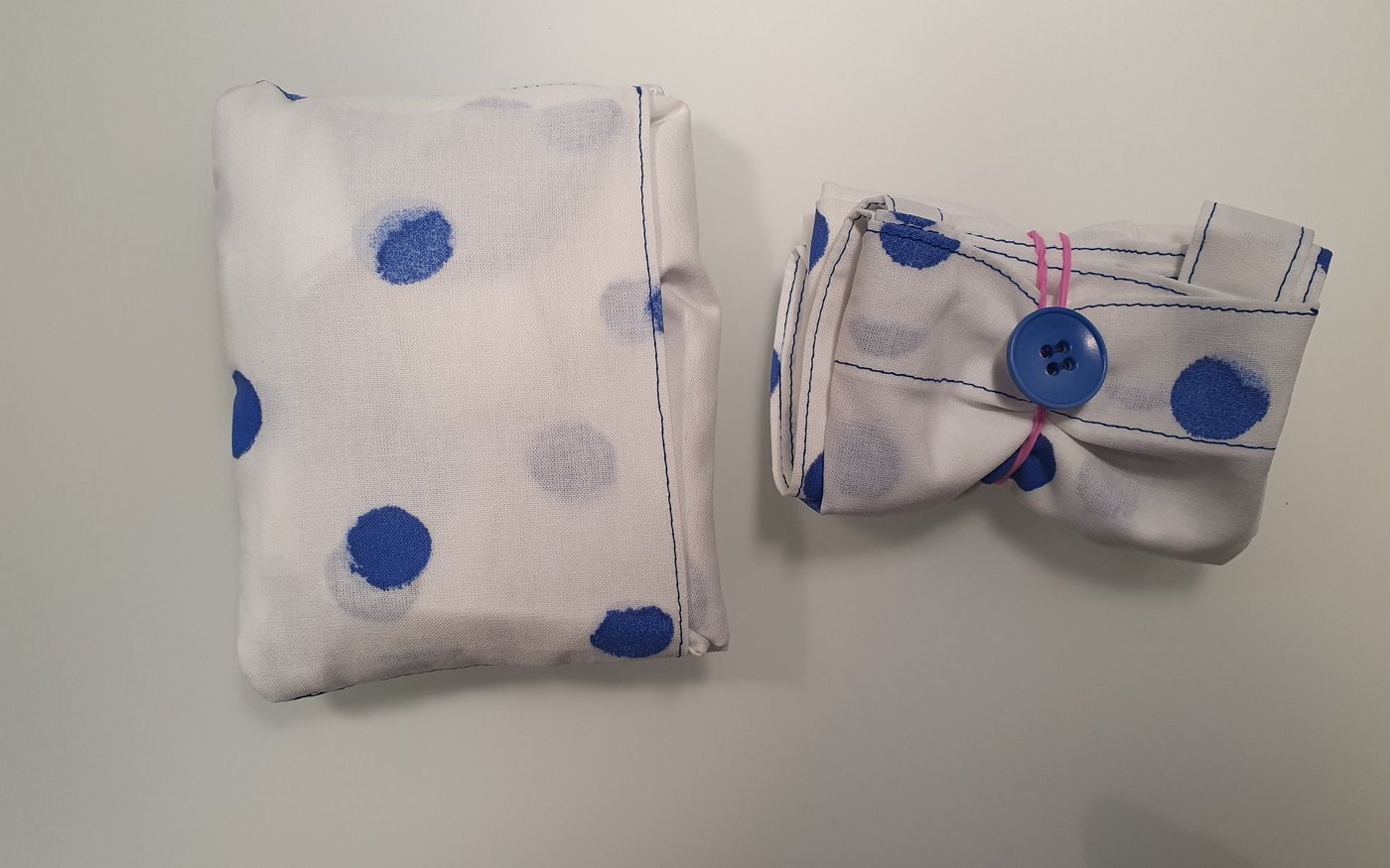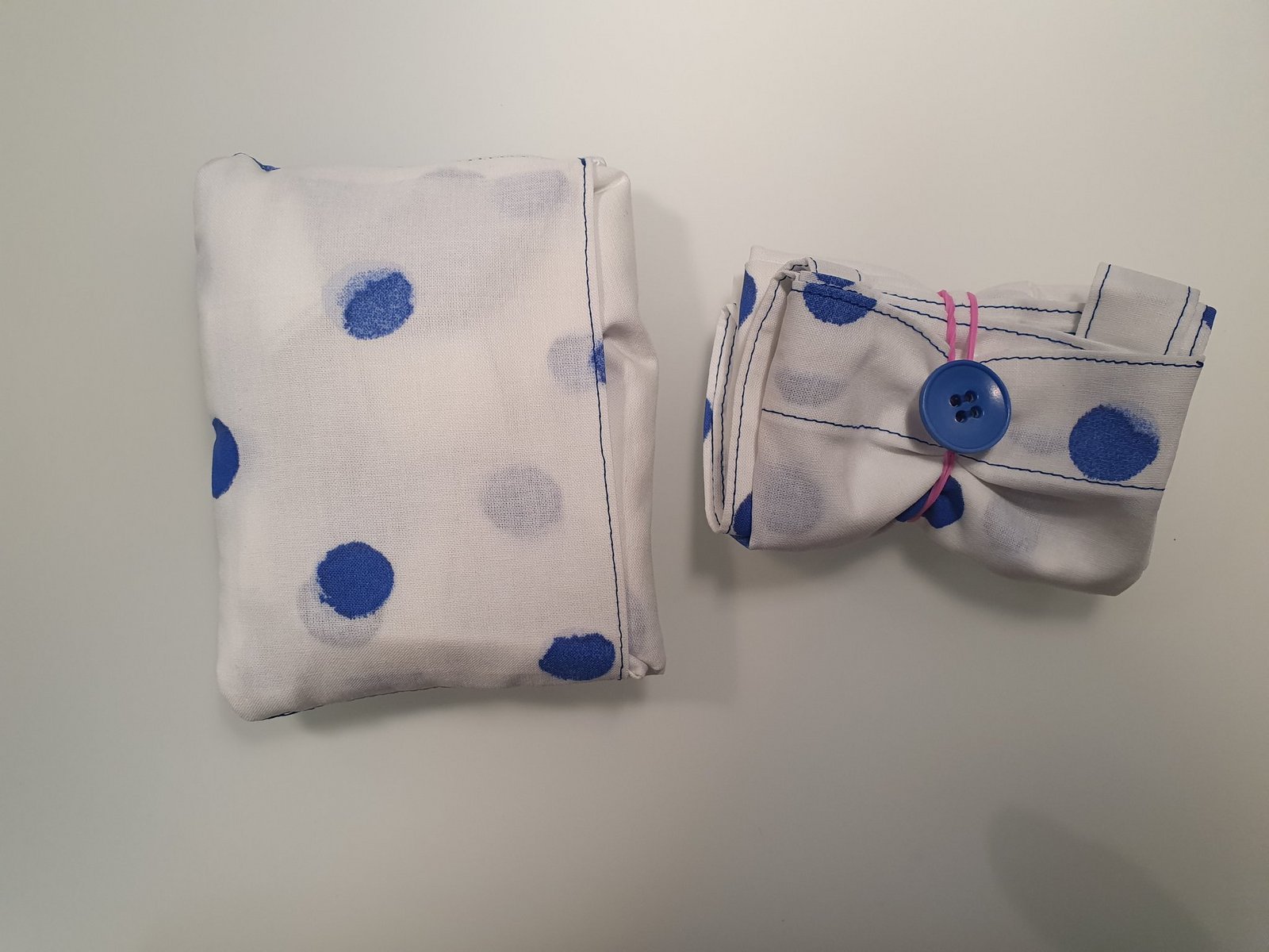 - Bei der kleinen Tasche auf einer Seite einen Kopf zwischen die Henkel annähen und ein Gummiband daran befestigen. So kann man die Tasche bei Nichtgebrauch klein zusammen rollen und mit dem Gummi fixieren. Oder ein verstürztes Stück Stoff aufsteppen, um die Tasche kompakt darin zu versorgen.