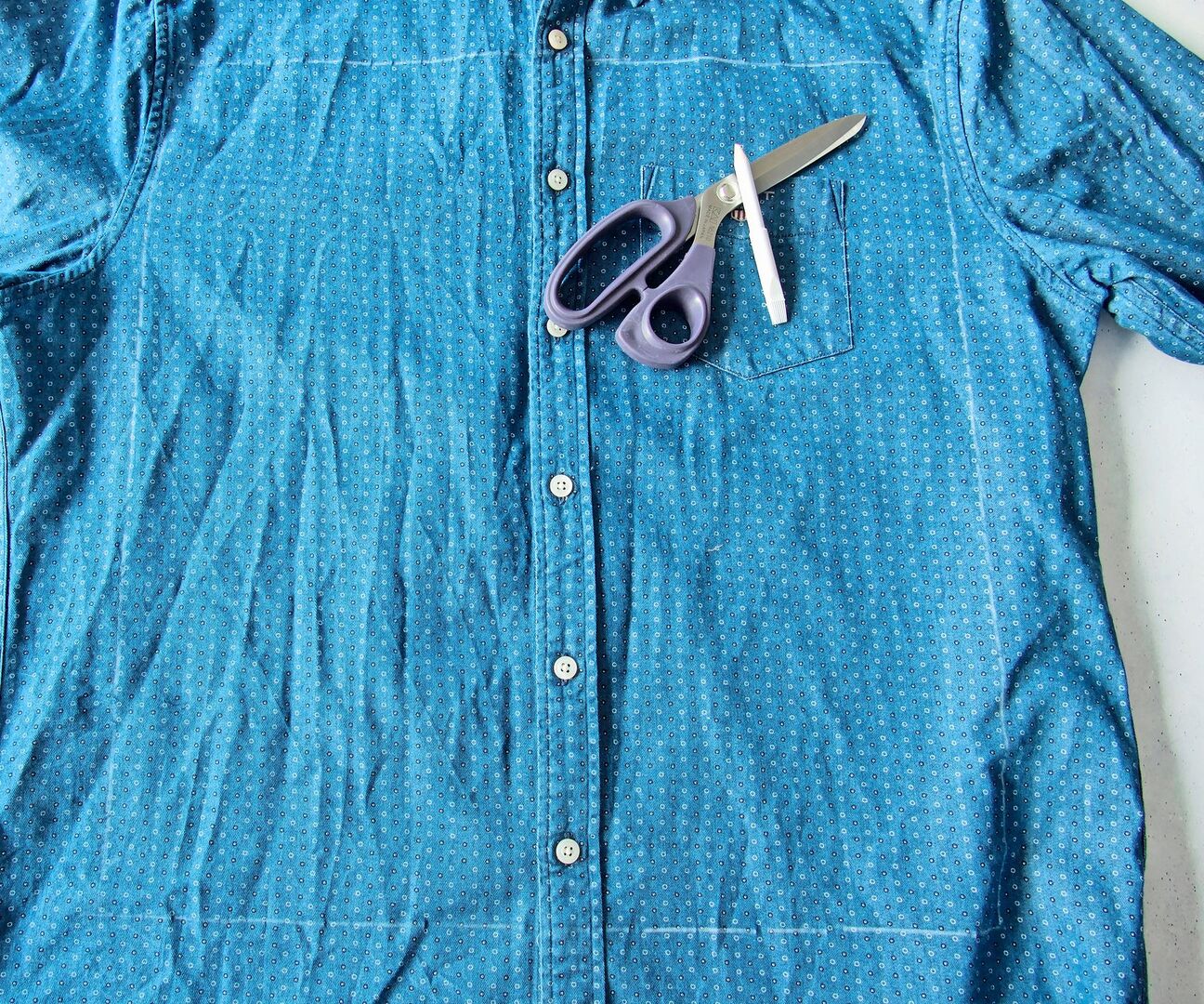 - Für ein 40 × 40 cm grosses Kissen zeichnen Sie ein 42 × 42 cm grosses Quadrat in die Mitte des Hemdes und schneiden es aus.