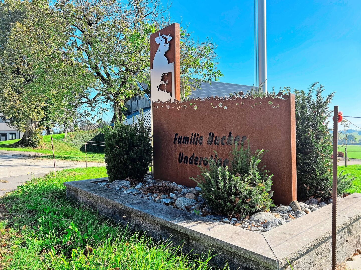 Lukas Bucher führt den vielseitigen Betrieb mit den Hauptzweigen Milchproduktion (Vollweidebetrieb mit saisonalem Abkalben und Melkroboter), Schweineproduktion (Deck-/Wartebetrieb in einem Ring) und Photovoltaik, mit einem Lernenden und den Eltern im Angestelltenverhältnis.