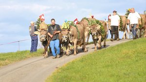Geschmückte Alpabzüge mit den Wettstein-Kühen