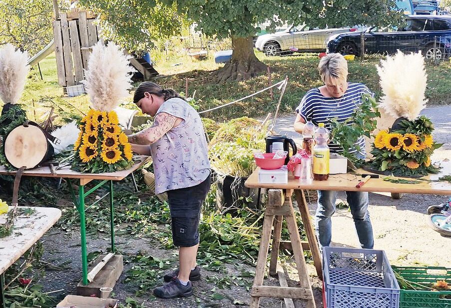 Am Donnerstag vor der Ausstellung sei sie jeweils fast den ganzen Tag unterwegs, um Blumen und anderes benötigtes Material zu organisieren. «Ich bekomme die Blumen von einem regionalen Gärtner zu einem Vorzugspreis, besser gesagt für einen Laib Alpkäse», so Renate Wettstein weiter. Sie selber sei zwar auch leidenschaftliche Gärtnerin, ihre eigenen Blumen würden aber nie ausreichen. Am Freitag dann kämen rund acht bis zehn Frauen aus dem Bekannten- und Verwandtenkreis auf den Hof. Den ganzen Tag werde – gesamthaft über 60 Stunden – am Kopfschmuck gearbeitet. «Für meine Frauen und mich ist das jeweils ein sehr geselliger Anlass mit Znüni, Zmittag und Zvieri.»