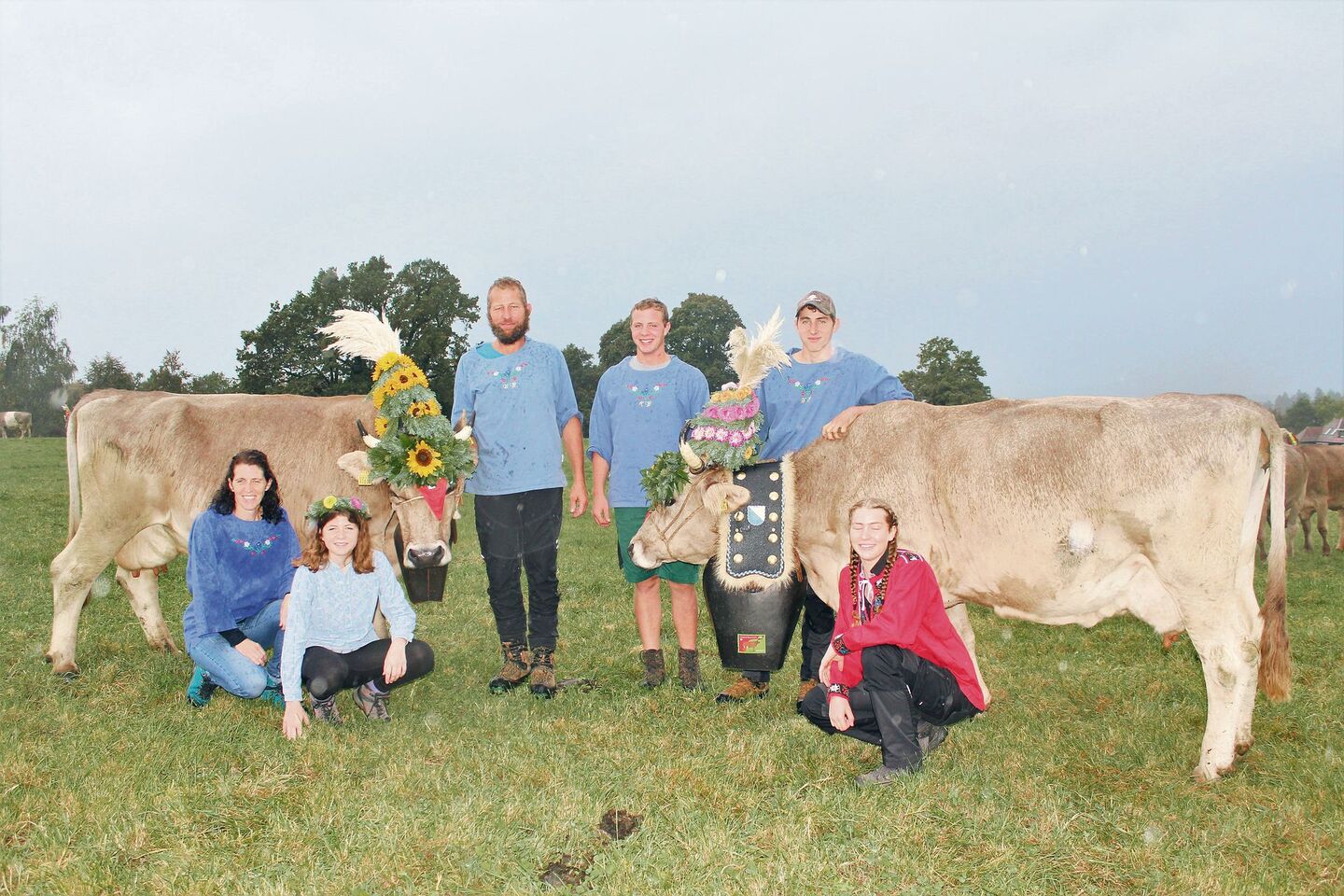 Nicht nur Renate und René Wettstein sind davon begeistert, mit geschmücktem Vieh «zu fahren», auch ihre Kinder Tobias, Fabian, Katja und Sarina machen mit Freude mit. Zudem helfen auch Kollegen und Kolleginnen der Kinder am Viehschautag und unterstützen die Familie. «Wir haben dazu auch langjährige erfahrene Helfer, ohne die es nicht möglich wäre, mit so einer grossen Viehherde auf den vielbefahrenen Strassen zu gehen», betont Renate Wettstein. Gegen 30 Personen treffen jeweils am Viehschaumorgen zeitig im Stall ein. Zu dritt wird jedem Tier der Blumenschmuck montiert, eine Glocke umgehängt und dann wird es auf die Weide vor dem Stall geführt. Der grösste Teil des Glockengeläuts ist im Besitz der Familie, einige Bissen werden auch von Bekannten eingemietet.
