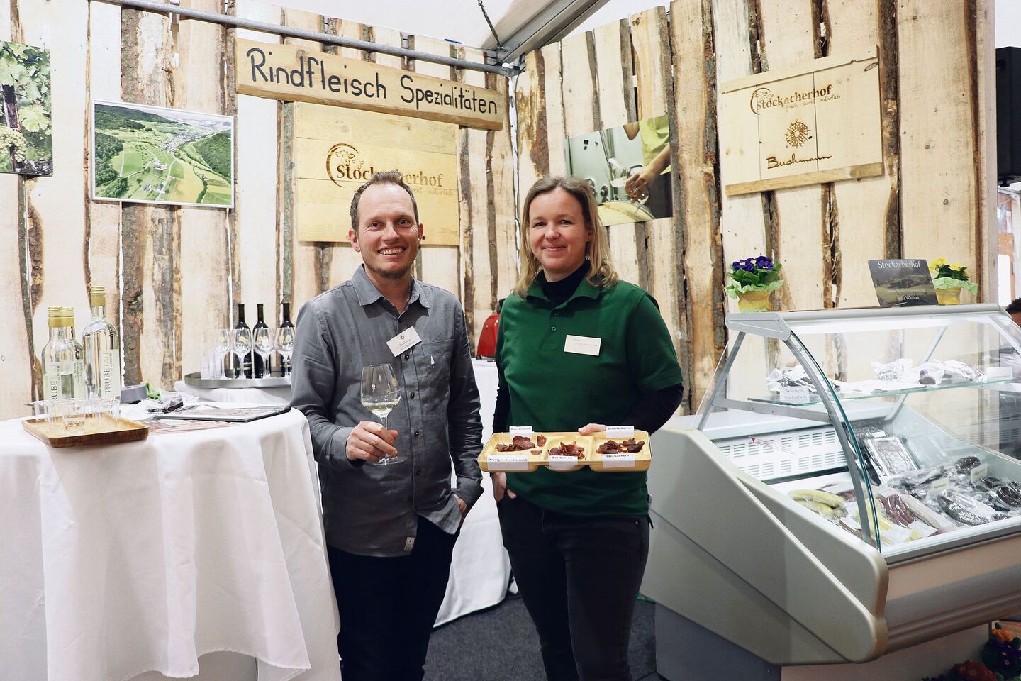 Mit dabei an der AMA war ein Team aus Wittnau, schon zum dritten Mal: Der Stockacherhof von Familie Uebelmann und Buchmann Weine teilen einen Stand. «Wir repräsentieren das Fricktal, damit es in dieser Region nicht vergessen geht», sagte Weinproduzent Daniel Buchmann. Es gehe nicht um den grossen Umsatz während der fünf Messetage, wichtig seien Basiswerbung und Akquirierung von neuer Kundschaft. Kreative Produkte wie Traubensaftschorle und die Trockenfleischkreationen, die Tamara Uebelmann zum Degustieren anbietet, sorgten für Aufmerksamkeit.