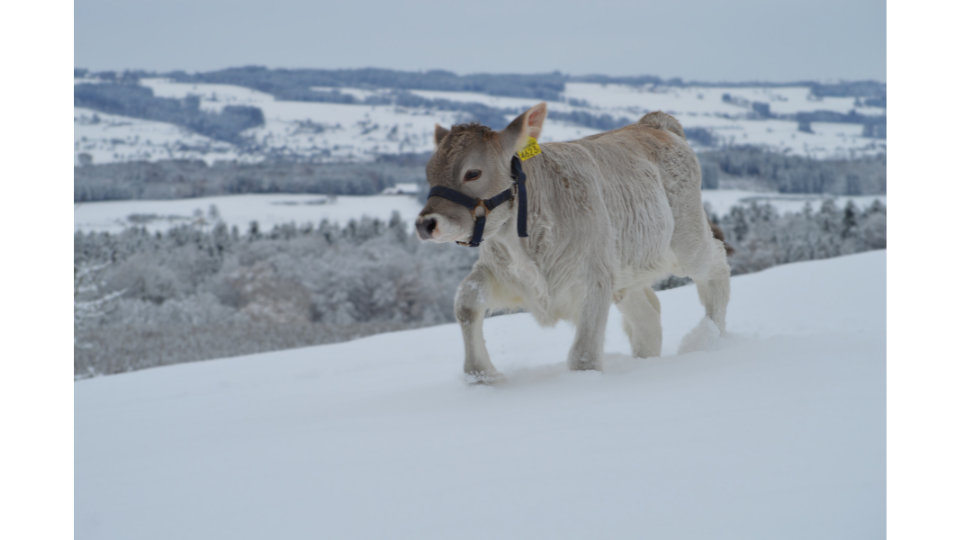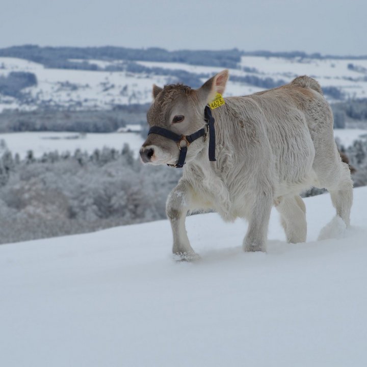 Braunvieh, Traumvieh, Traumlandschaft: Das Kalb erkundet die ihm noch ungewohnte weisse Landschaft. (Bild: Roman und Patricia Sidler, Cham ZG)