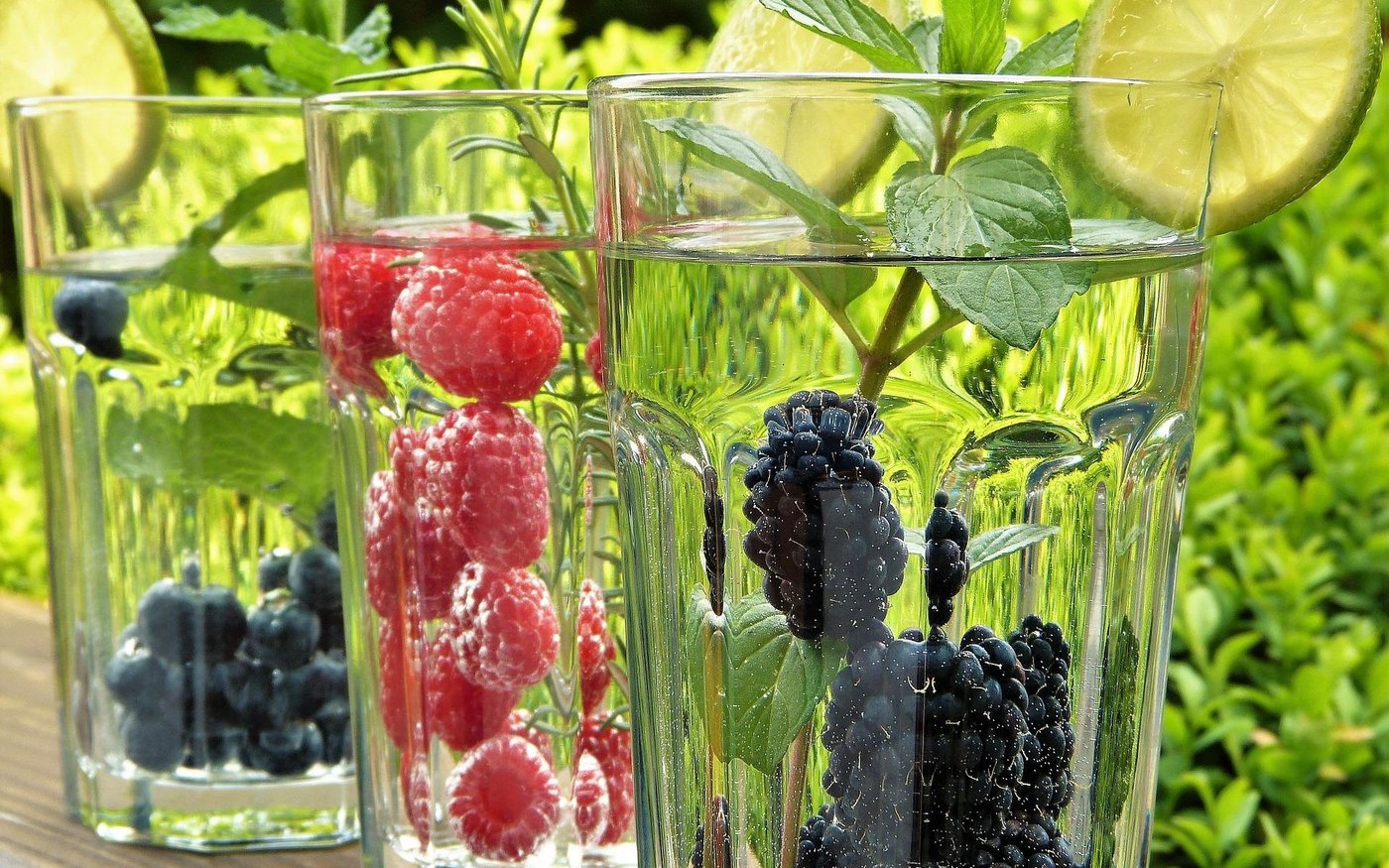 - Mit Kräutern wie Minze oder Zitronenmelisse; mit Früchten wie Zitrone, Orange, Beeren oder auch mit Gurke oder Ingwer im Wasser.