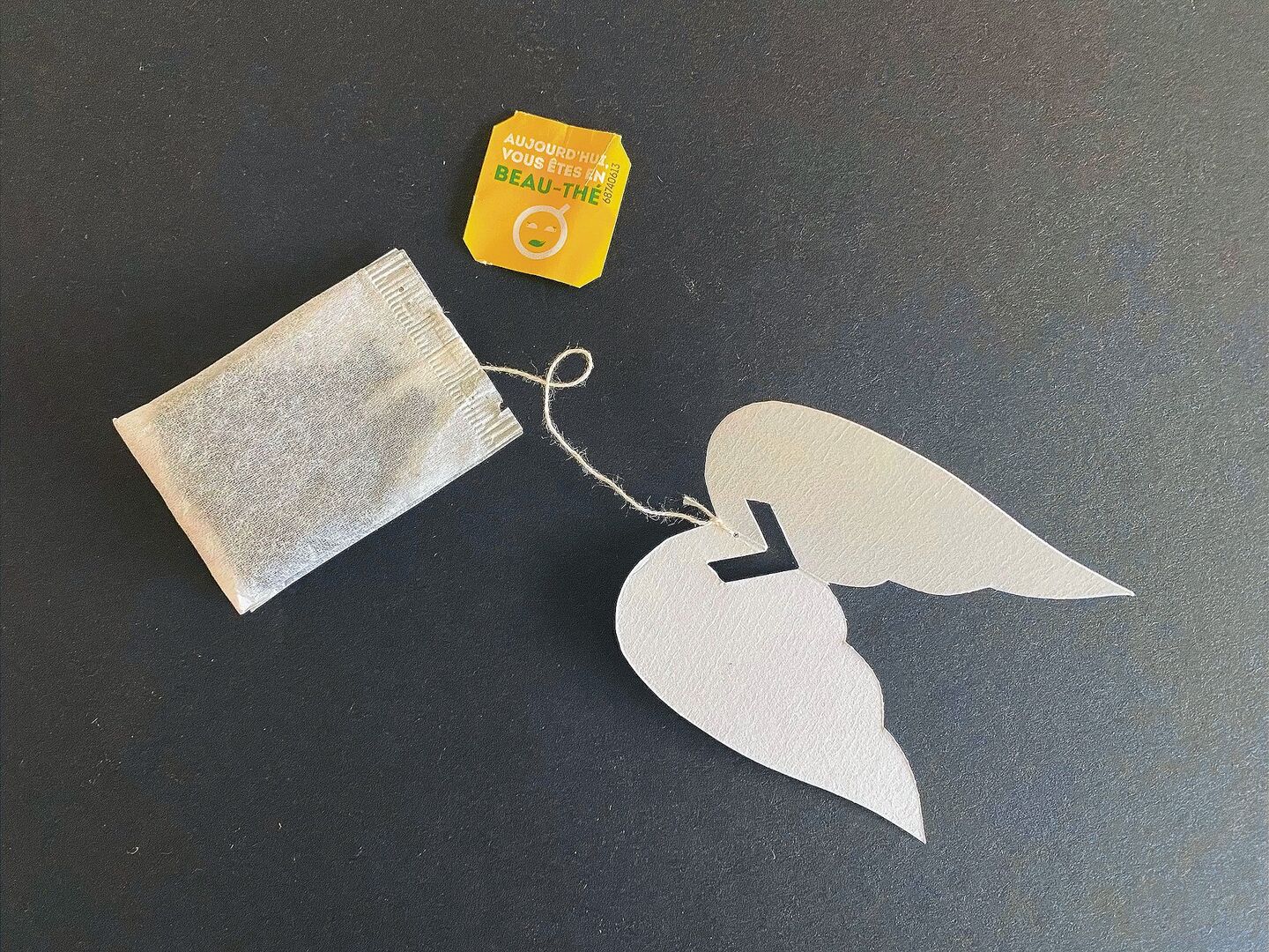 - Stechen Sie mit einer Nadel ein Loch in die Bruchkante und knüpfen Sie die Schnur des Teebeutels an den Papierhalter.