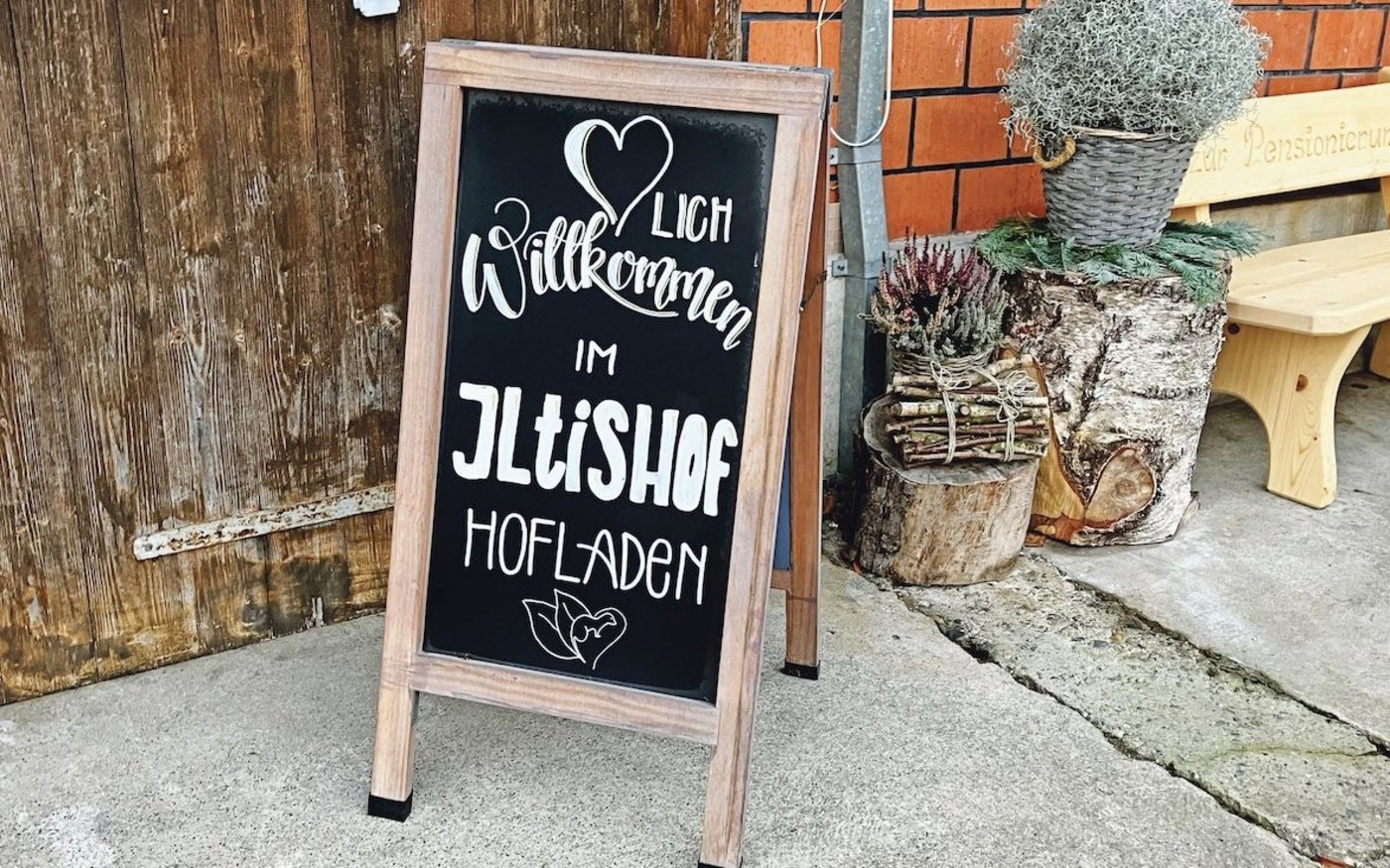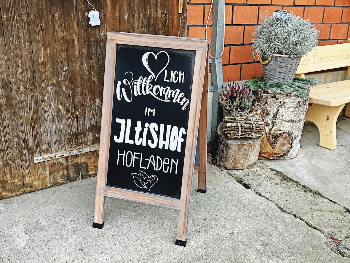 Ein Willkommensgruss, sorgfältig in Handletteringschrift auf eine Tafel gemalt, Türkränze mit Thujazweigen und winterliche Kerzengestecke: Hier wird gerne kreativ gestaltet und dekoriert, wie man als Besucher(in) des Hofladens sofort bemerkt. «Die Weihnachtszeit bietet sich besonders an für Dekorationen dieser Art. Viele Adventskränze waren rasch weg», stellt Sandra Reinhardt-Weber vom Iltishof im thurgauischen Iltishausen bei Aadorf fest.