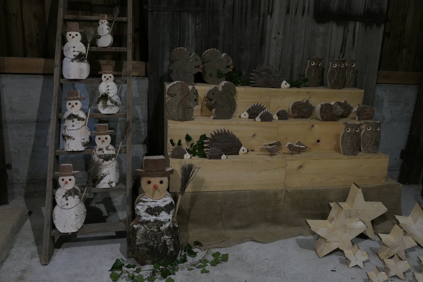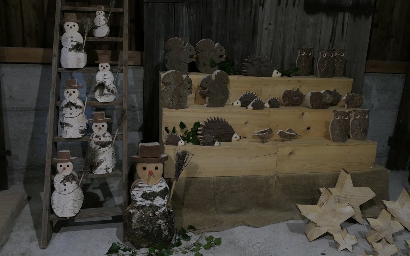Die Produktion beginnt jeweils Anfang November. Hinter der Arbeit steht ein ganzes Team, bestehend aus Familie und Freunden sowie zwei weiteren Bauern aus der Umgebung. Der Vater als Hauptinitiator ist vor rund anderthalb Jahren verstorben. «Es ist auch in seinem Sinn, dass wir unsere Holzdekorationen weiter anbieten», sagt die Tochter. Nachdem das Holz bereits Anfang Jahr eingelagert wurde, ist es im Herbst in getrocknetem Zustand bereit zum Bearbeiten. Wichtig sei, dass die Rinde dranbleibt, erklärt Carmen Küng. Diese bildet einen wichtigen Bestandteil der Dekoration. Einem Eichhörnchen etwa verpasst die dunkle Fichtenrinde eine Felloptik. Zum Schneemann dagegen passt die silberglänzende Rinde der Birke.