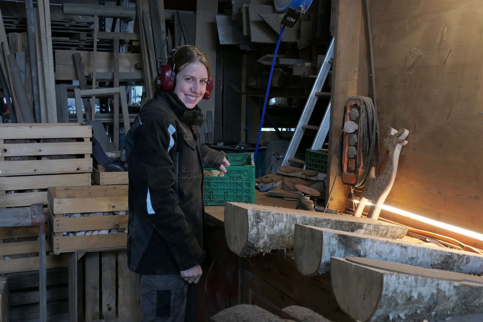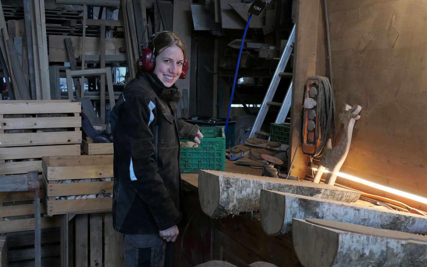 Zur Verwendung kommen verschiedene Hölzer. Je nach Sujet sind es Fichte, Föhre, Birke, Buche oder Obst- und Nussbäume. Letztere sind härter zum Bearbeiten als Nadelbäume. Der Arbeitsaufwand ist entsprechend grösser. So lässt sich etwa aus einer Apfelbaumkrone eine Kugel sägen, was rund drei bis vier Stunden Sägearbeit beansprucht. Das Hauptwerkzeug ist die Bandsäge. Bei gröberen Schnitten kommt dagegen die Motorsäge zum Einsatz. Arbeitsort ist die Scheune, wo genügend Platz vorhanden ist. Jährlich werden rund 25 Bäume verarbeitet. Küngs wählen sie in Absprache mit dem Revierförster selbst aus und transportieren sie vorsichtig nach Hause, damit die Rinde ganz bleibt. Diese ginge kaputt, wenn die Stämme wie üblich aus dem Wald herausgeschleppt würden.
