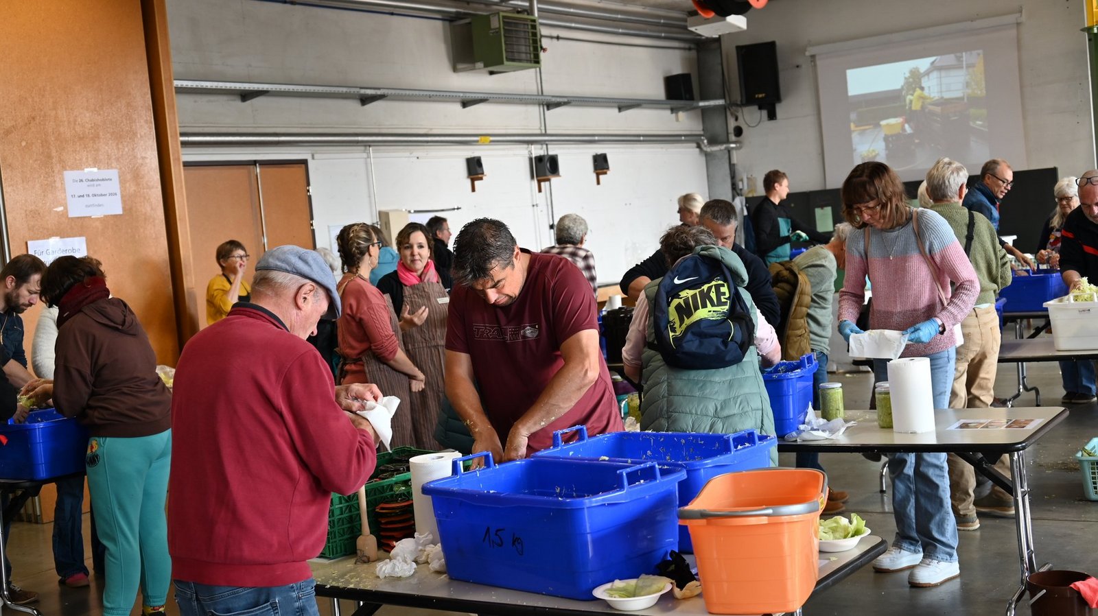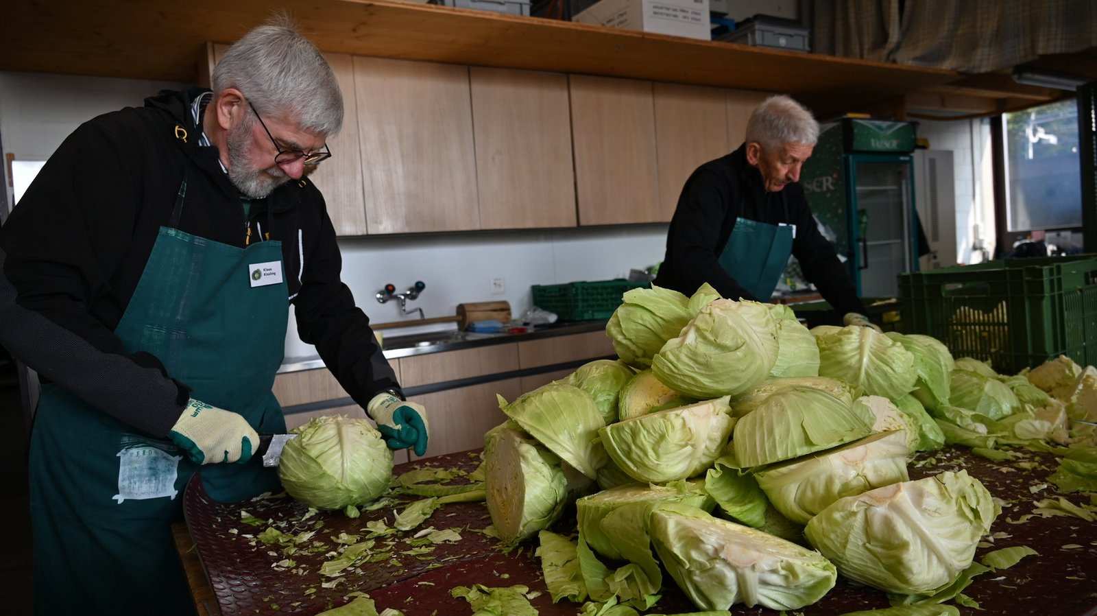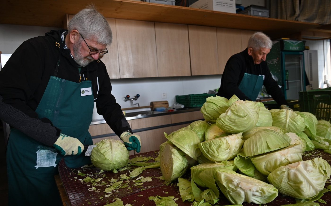 Bereits am Vorabend wurde eine Charge Chabisköpfe halbiert und die Storzen entfernt. Um 7.30 Uhr am Samstagmorgen wurde mit dem Hobeln begonnen. Diese Vorlaufzeit ist dringend nötig. Denn bereits beim offiziellen Beginn um 10 Uhr hatte sich eine lange Schlange vor der Chabisausgabe gebildet. Pia Kofmel, Verantwortliche der Abteilungen Entstorzen, Hobeln und Waagausgabe, erzählt, dass bereits um 10.30 Uhr eine Tonne Chabis den Hobeln zum Opfer gefallen sei.
