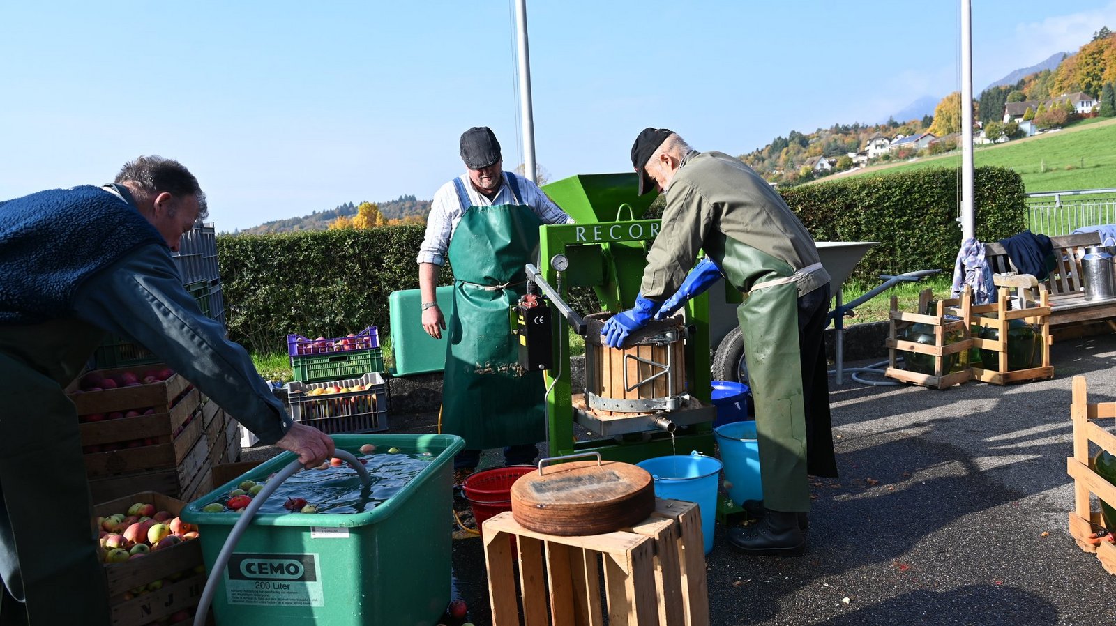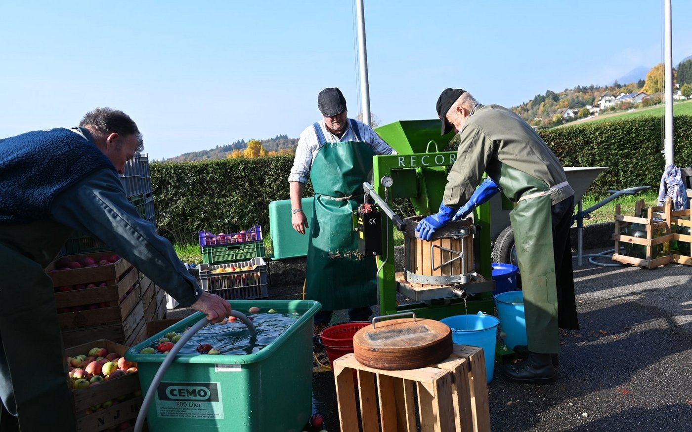 Ein kleiner Markt, die Festwirtschaft und die Apfelsaftpresse, die direkt vor Ort mostet, runden den Anlass ab.