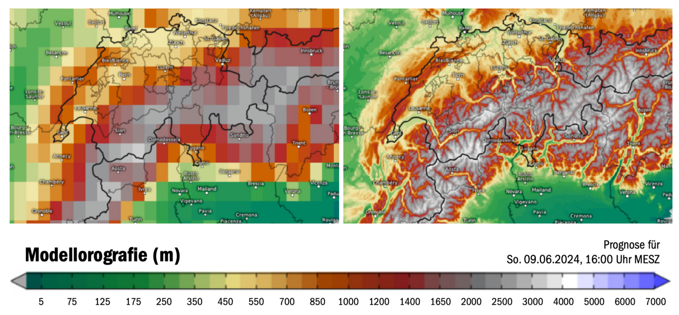 Der Unterschied im Abstand der Gitterpunkte der jeweiligen Modelle ist deutlich erkennbar und zeigt, dass bei den gröber aufgelösten Modellen zum Beispiel die Topografie der Schweizer Alpen verwischt wird und damit auch die daraus resultierenden Informationen bzw. die Darstellung von Regen oder Wolken.