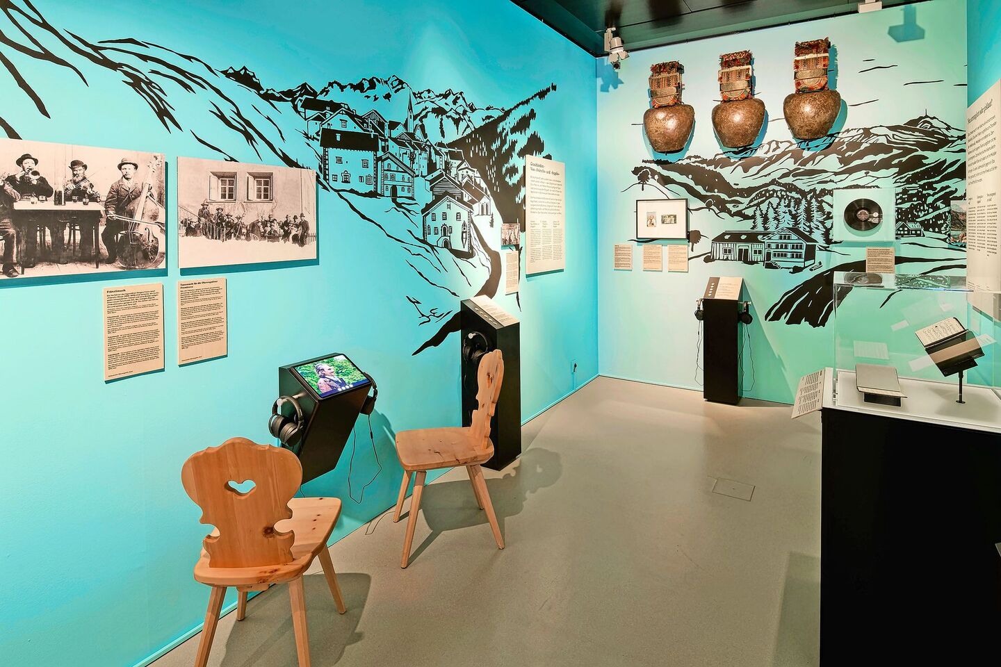 Im Mittelpunkt der Ausstellung stehen vier prägende Elemente der Volksmusik: Schwyzerörgeli, Alphorn, Hackbrett und Jodel. Die Entwicklung des Schwyzerörgelis revolutionierte um 1883 die Volksmusik. Denn es brachte gleichzeitig Melodie, Begleitung und Rhythmus hervor. Damit verdrängte es vielerorts die bisher üblichen Streich- und Blasinstrumente. Es wurde gerade auch im ländlichen Raum populär, da oft das Geld oder die Instrumente fehlten. Die Hersteller Eichhorn, Nussbaumer und Salvisberg perfektionierten den zunächst als simpel beschriebenen «Chuedräckler» zu einem eigenständigen Instrument.