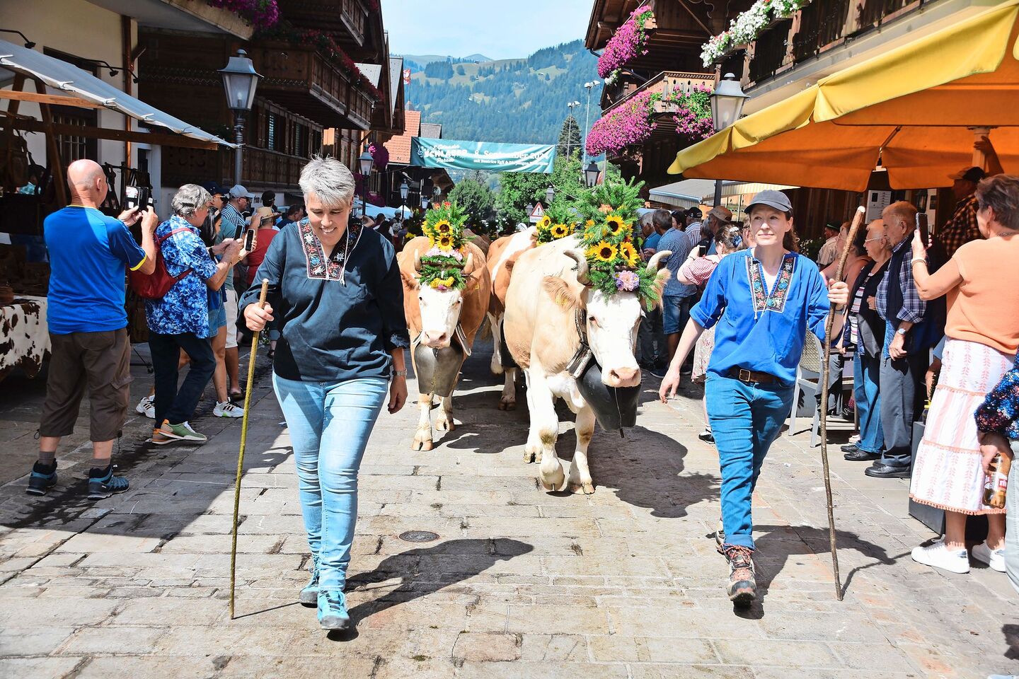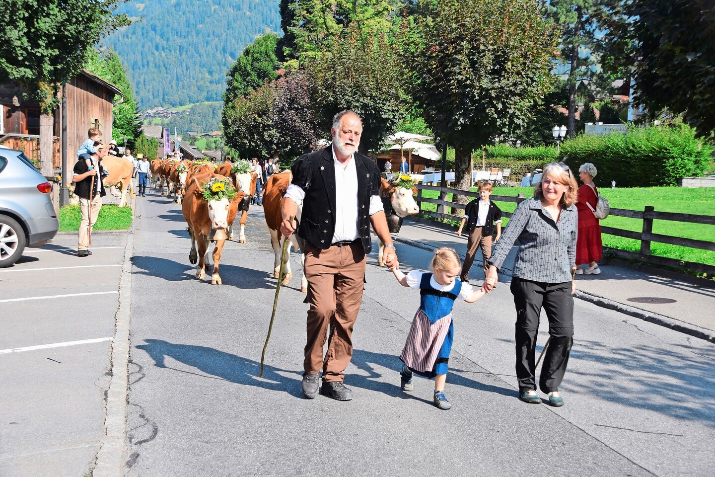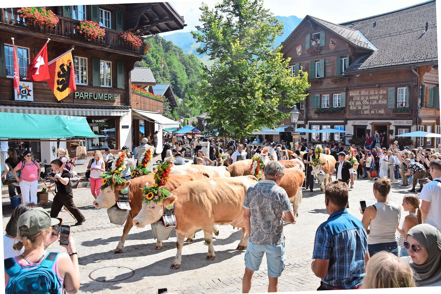 Für einmal standen im Nobelort Gstaad BE nicht die Schönen und Reichen im Mittelpunkt, sondern die Bauern mit ihren Kühen. Am Samstag, 31. August, brachten an der Gstaad-Züglete mehrere Familien ihre Viehherden von der Alp zurück ins Tal und durchliefen dabei die Stadt-Promenade des Ortes. Zu Hunderten standen die Schaulustigen am Strassenrand Spalier – manchmal gab es für Kühe und Bauern fast kein Durchkommen mehr. Neben Einheimischen, Chalet-Gästen und Geschäftsleuten tummelten sich auch viele Touristen aus der ganzen Schweiz sowie aus dem Ausland auf der Promenade.