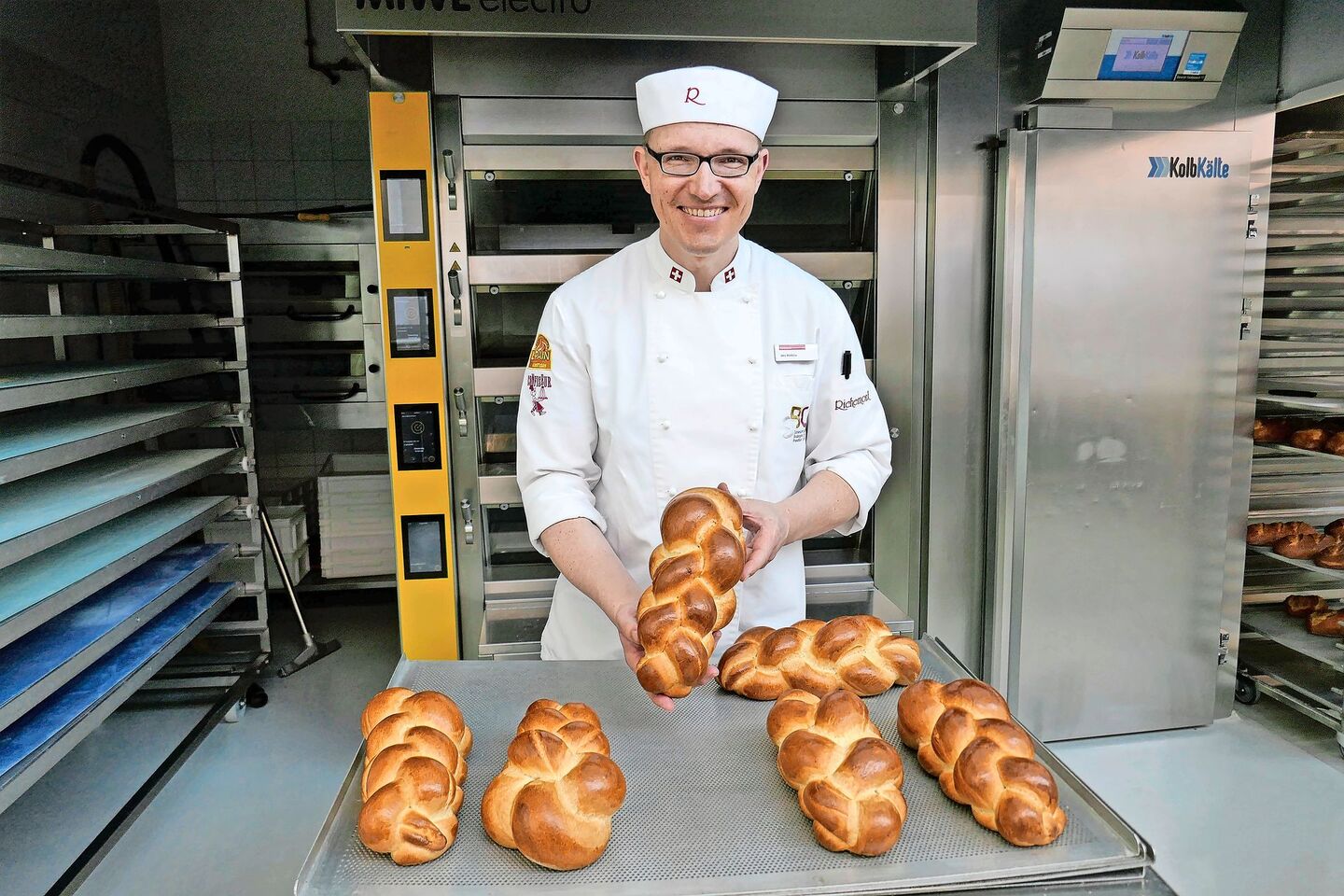 «Das Farbspiel von helleren und dunkleren Stellen. Das gefällt mir besonders beim Butterzopf», sagt Urs Röthlin, Leiter Bäckerei und Feinbäckerei der Bäckereifachschule Richemont in Luzern. Der selbstgemachte Zopf, den er zeigt, ist glänzend goldbraun, verjüngt sich etwas zur Spitze hin und die Stränge liegen auf einer Linie.