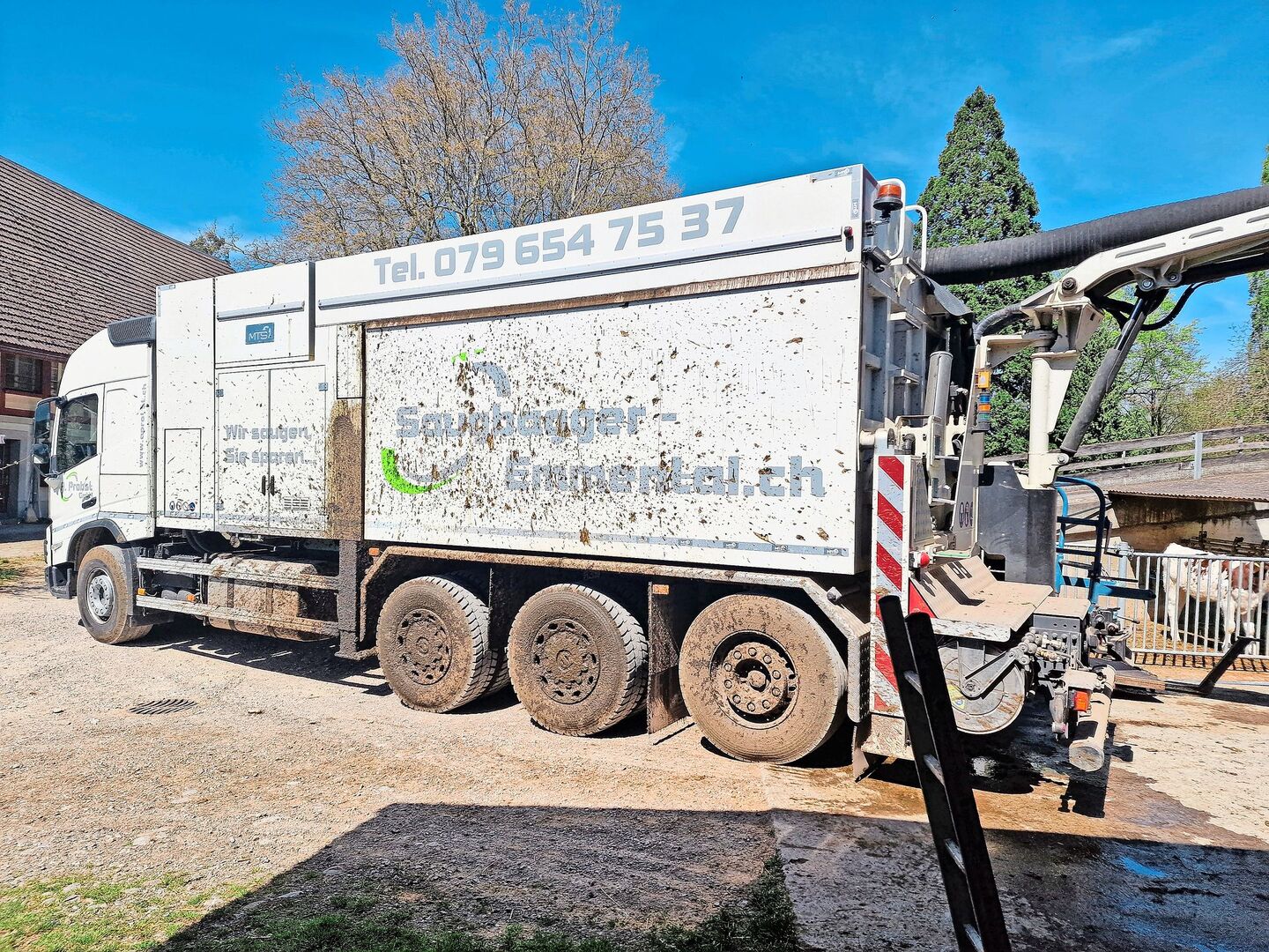 Irgendwie sieht es nach einem «Scheissjob» aus. Wer die Spuren am Saugbagger studiert, weiss, worum es hier geht. Auf dem Hausplatz eines Bauernhofs im Berner Mittelland steht der Koloss – ein 4-Achs-Saugbagger. Rund zehn Kubik kann er laden. Sand, Steine, Erde, Schlacke und Schüttungen, aber auch Kompost, Holzschnitzel, Pellets oder eben, wie es beim Besuch der BauernZeitung der Fall ist, Gülle.