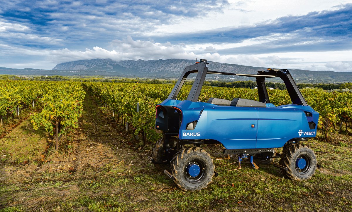 Auch «Bakus» vom französischen Start-up Vitibot kann mehr als Hacken. Am autonom fahrenden Roboter können neun verschiedene Werkzeuge befestigt werden, unter anderem eine Fingerhacke oder Scheibenschare. Die Tools kann man selber austauschen. Bakus kann in Hängen mit bis zu 25 Prozent Neigung fahren und wenden. Er bringt 2400 Kilogramm auf die Waage, ist also auch kein Federgewicht.