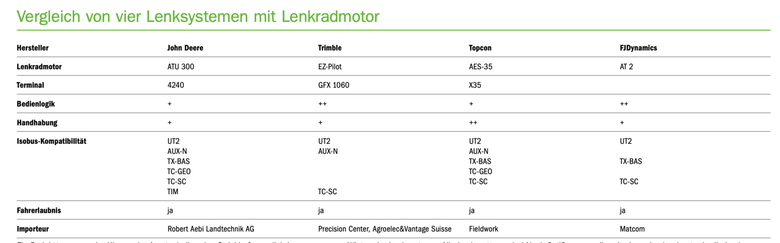 Wichtig ist die Strassenzulassung, welche die Lenksysteme haben müssen. Fehlt diese, müsste der Landwirt den Lenkradmotor vor jeder Strassenfahrt abbauen. Die getesteten Systeme können zwischen verschiedenen Fahrzeugen gewechselt werden. Der GNSS-Empfänger (Satellitensignal-Empfänger) und das Display sind rasch auswechselbar. Weitere Bauteile wie der Lenkradmotor, der Kabelbaum und bei einigen Systemen ein optionaler Lenkwinkelsensor, welcher die Genauigkeit verbessern soll, werden fest installiert.