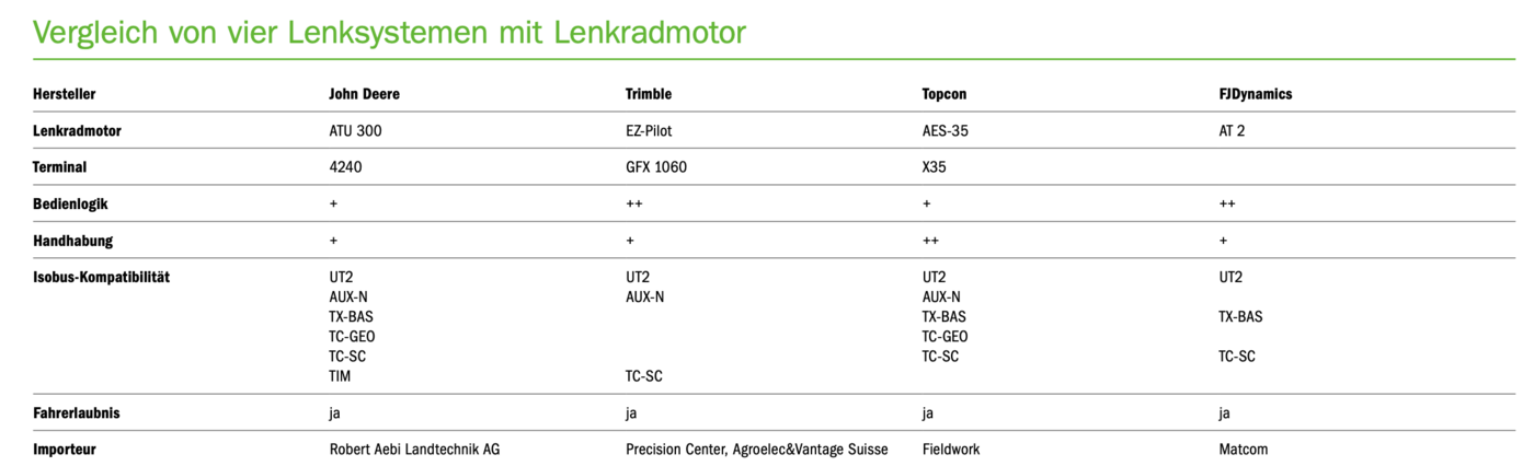 Ein Projektteam aus der Klasse der Agrotechniker des Strickhofs in Lindau ZH hat im vergangenen Winter vier Lenksysteme verglichen. Alle Lenksysteme sind Nachrüstlösungen, welche mit einem Lenkradmotor in die Lenkung eingreifen. Der Vergleich bietet in erster Linie eine Orientierungshilfe und zeigt auf, worauf bei einer Investition zu achten ist. Die Systeme von John Deere, Trimble, Topcon und FJDynamics wurden für diesen Test ausgewählt. Damit sind Geräte aus verschiedenen Preisklassen vertreten. Die Preise variieren zwischen Fr. 7000.– und Fr. 20 000.–. Neben den getesteten Lösungen gibt es auch weitere Anbieter.