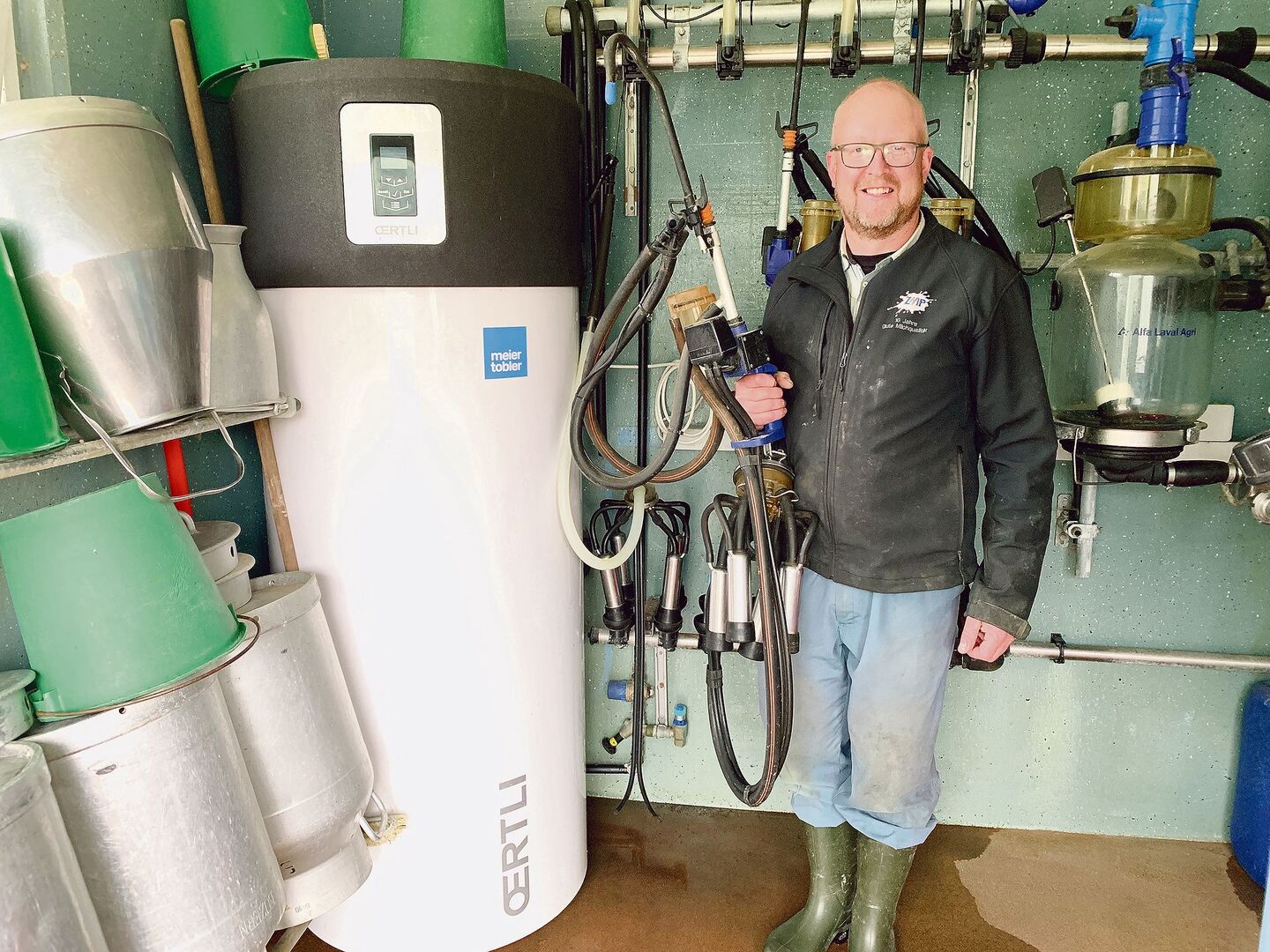 In der Fachpresse las er von der finanziellen Unterstützung von Wärmepumpenboilern (WPB), welche Agro Clean Tech (ACT) im Rahmen des Energie-Effizienzprogramms von ProKilowatt anbietet. So installierte er im August gleich zwei solcher Boiler, einen in seinem Milchraum, einen weiteren bei der Milchsammelstelle in der gleichen Scheune. Vorteil der Wärmepumpenboiler sei, dass nun kontinuierlich 60-grädiges Wasser in den beiden je 300 Liter fassenden Speichern erwärmt wird, und das nur noch mit einem 220-Volt-Anschluss.