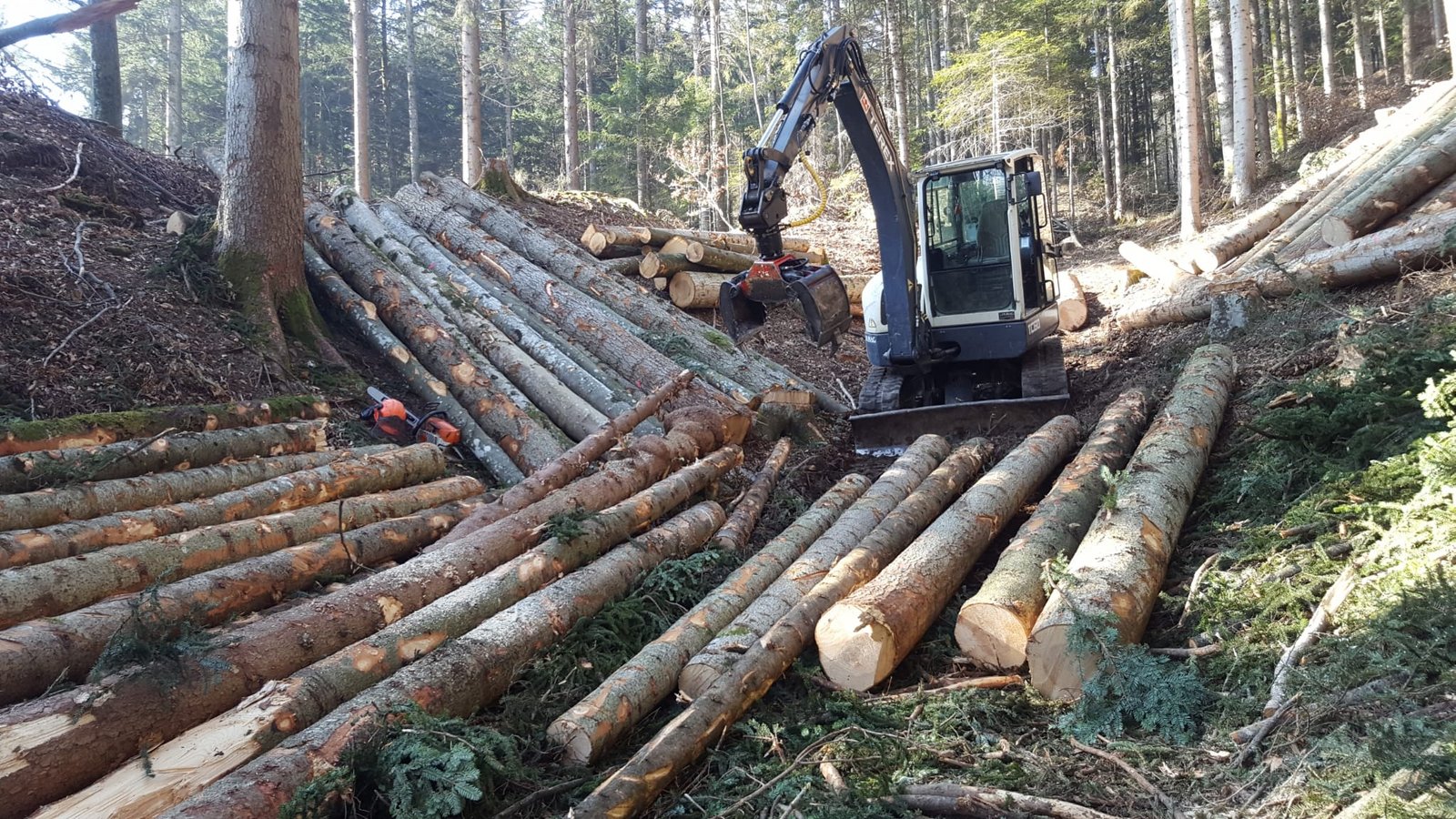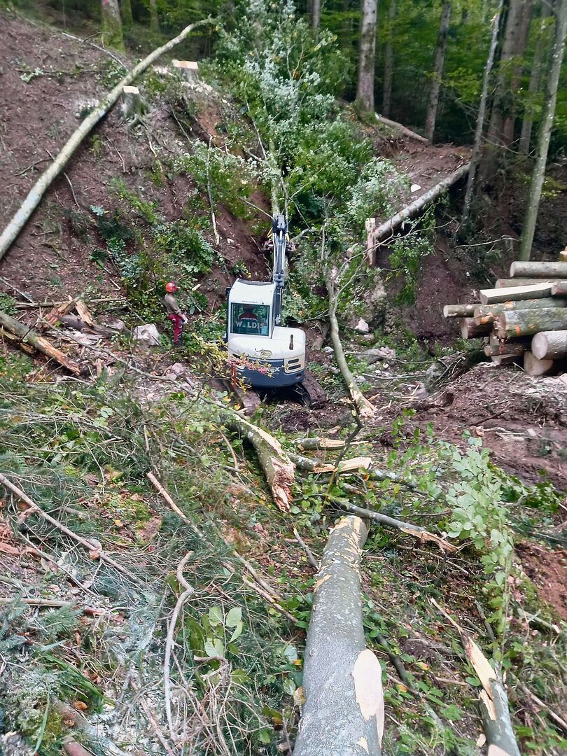 Der Fokus im Forst liegt auf der Gebirgsholzerei, «für grossflächige Holzerei im Mittelland sind wir nicht ausgerüstet». Jährlich schlägt das Unternehmen rund 1400 m3 Holz. Die Wälder an den steilen Hängen im Rigi-Gebiet seien vor allem auf der Luzerner Seite schlecht mit Strassen erschlossen, hier kämen deshalb meist Seilkrane zum Einsatz. Reto Waldis ist gar nicht so unglücklich, dass es hier weniger Waldstrassen gibt. Die Erstellung und der Unterhalt seien sehr kostenintensiv. Da sei es ökonomisch sinnvoller, alle paar Jahrzehnte eine Seilbahn zu montieren für die Holzschläge.[IMG 3,4]