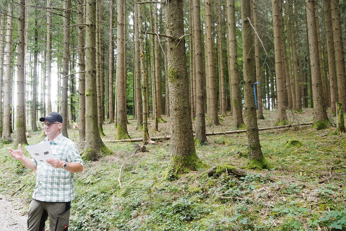 Das zeigte sich auf einer Begehung beim Forsthof Egg in Thundorf auf einer Höhe von 540 Metern. Revierförster Max Brenner präsentierte eine Schneise, die das Sturmtief Lothar Ende Dezember 1999 geschlagen hatte. Trotz der Bemühung, andere Arten nachzuziehen, dominieren Fichten und Weisstannen das Bild. «Eichen haben Mühe, sich durchzusetzen», konstatiert Max Brenner. Man sei mit dem Umbau des Waldes noch nicht so weit, wie man sich das wünsche. Das gleiche Bild präsentiert sich bei einem Saumschlag zur Verjüngung des Waldes entlang eines Waldweges. «Fichten und Tannen kommen als erste», stellt Brenner fest. Laubholzarten wie Ahorn, Kirschen und Eichen würden einen menschlichen Schutz benötigen, um sich zu behaupten. «Wenn dieser fehlt, gibt es wieder einen Nadelwald.»