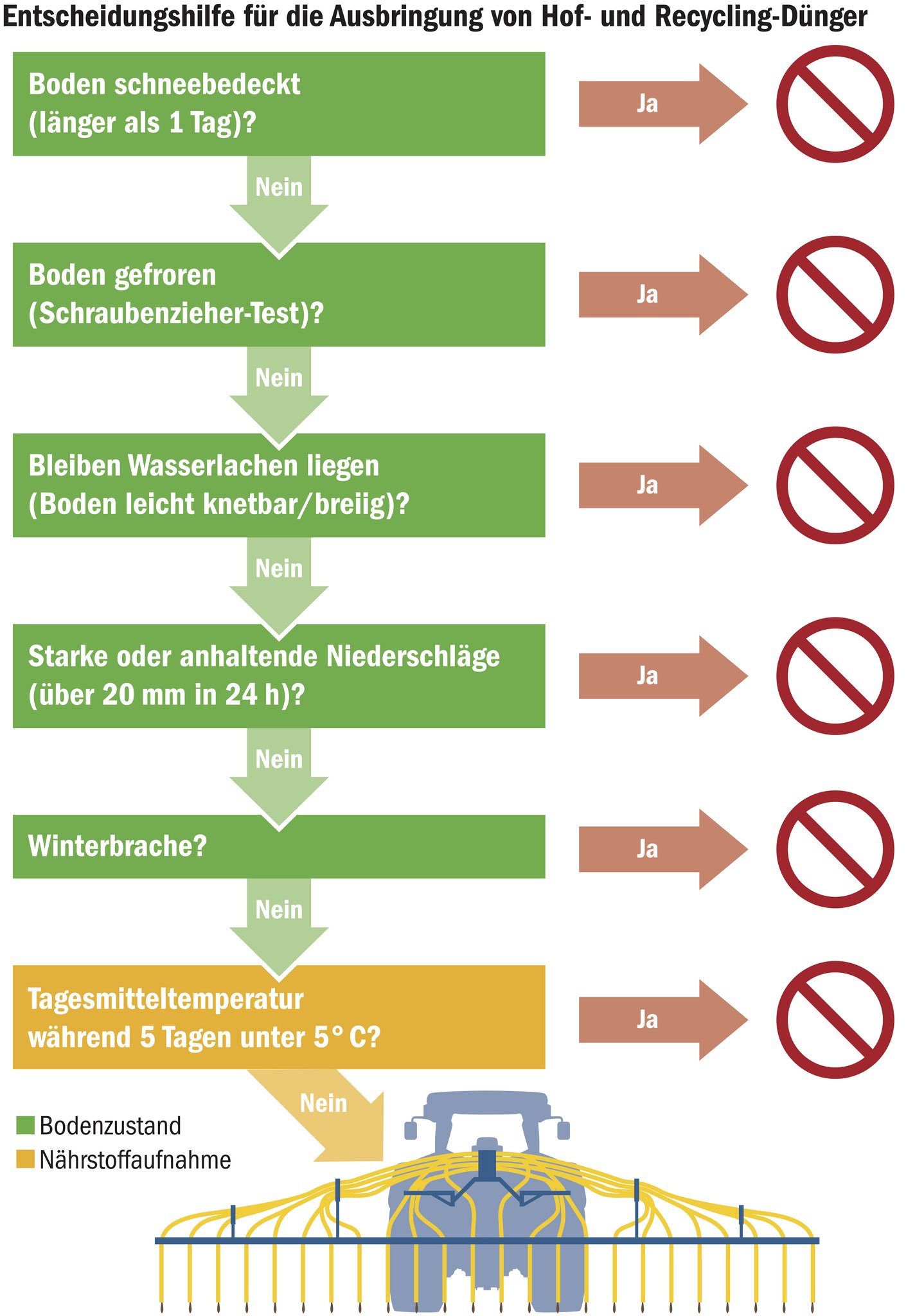 Die Sonne scheint, die Tagestemperaturen sind frühlingshaft und ein Hauch von Gülle liegt in der Luft. Einige Landwirte oder Landwirtinnen bringen ihre Hofdünger bereits jetzt auf den Feldern aus. Gemäss der Chemikalien-Risikoreduktions-Verordnung ist das Ausbringen von Hofdüngern in den Wintermonaten verboten – wenn der Boden wassergesättigt, gefroren, schneebedeckt oder ausgetrocknet ist und die Pflanze Stickstoff nicht aufnehmen kann (Entscheidungshilfe siehe Grafik). D. h. solange es die Witterungs- und Bodenverhältnisse nicht zulassen und die Pflanzen sich in der Vegetationsruhe befinden, bleibt das Güllefass im Schopf.
