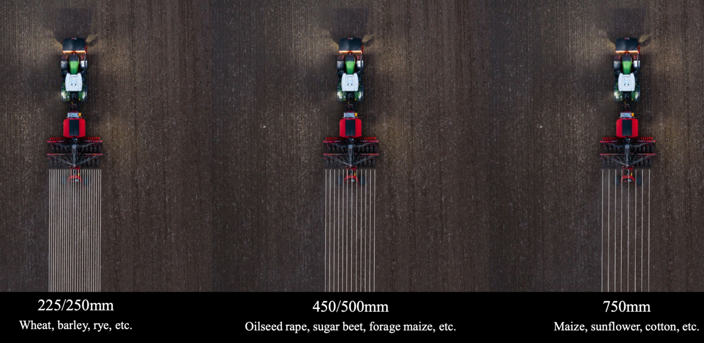 Variable Einsetzbarkeit: Die einzelnen Reihen sind einzeln zu- und abschaltbar. Die Säbreiten können von 225/250 mm (Getreide), 450/500 mm (Raps, Zuckerrübe, Mais) und 750 mm (Mais/Sonnenblumen) variieren. Die Maschine lasse sich somit ideal mit einer mechanischen Unkrautbekämpfung kombinieren. Auch eigne sie sich für die unterschiedlichsten Methoden der Saatbettbereitung wie Pflug, Mulch- und Direktsaat.