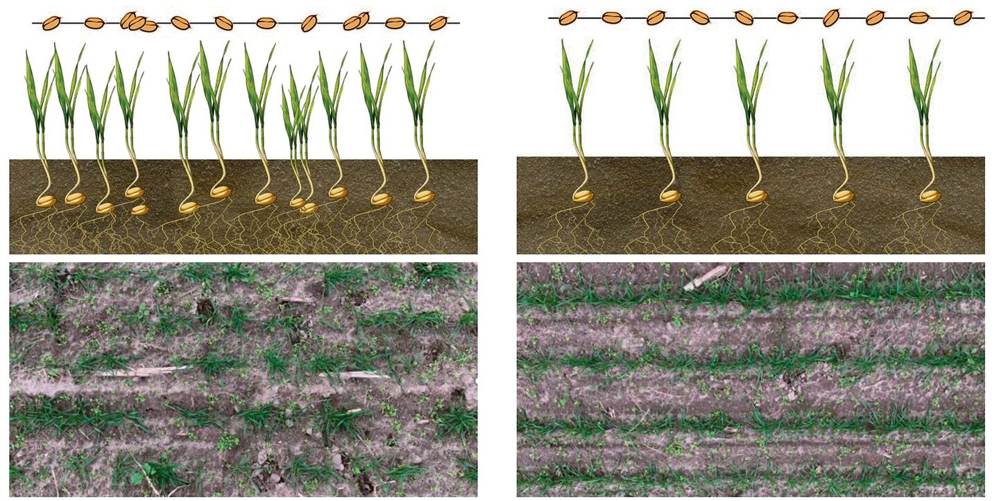 Die Idee hinter der Maschine ist einfach. Jedem Getreidekorn soll im Boden der grösstmöglich verfügbare Platz ab Saat zur Verfügung stehen. Erreicht wird dies üblicherweise mit Einzelkornsämaschinen, welche bisher für Kulturen mit tiefen Saatstärken wie zum Beispiel Mais (8–11 Körner/m2) oder Sonnenblumen (6–7 Körner/m2) eingesetzt werden.