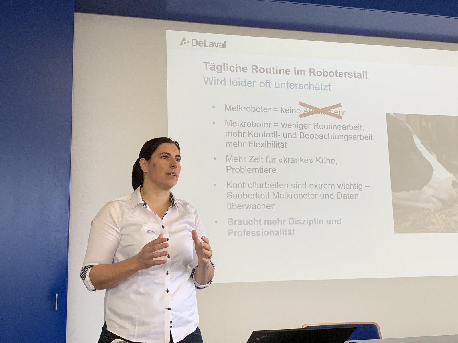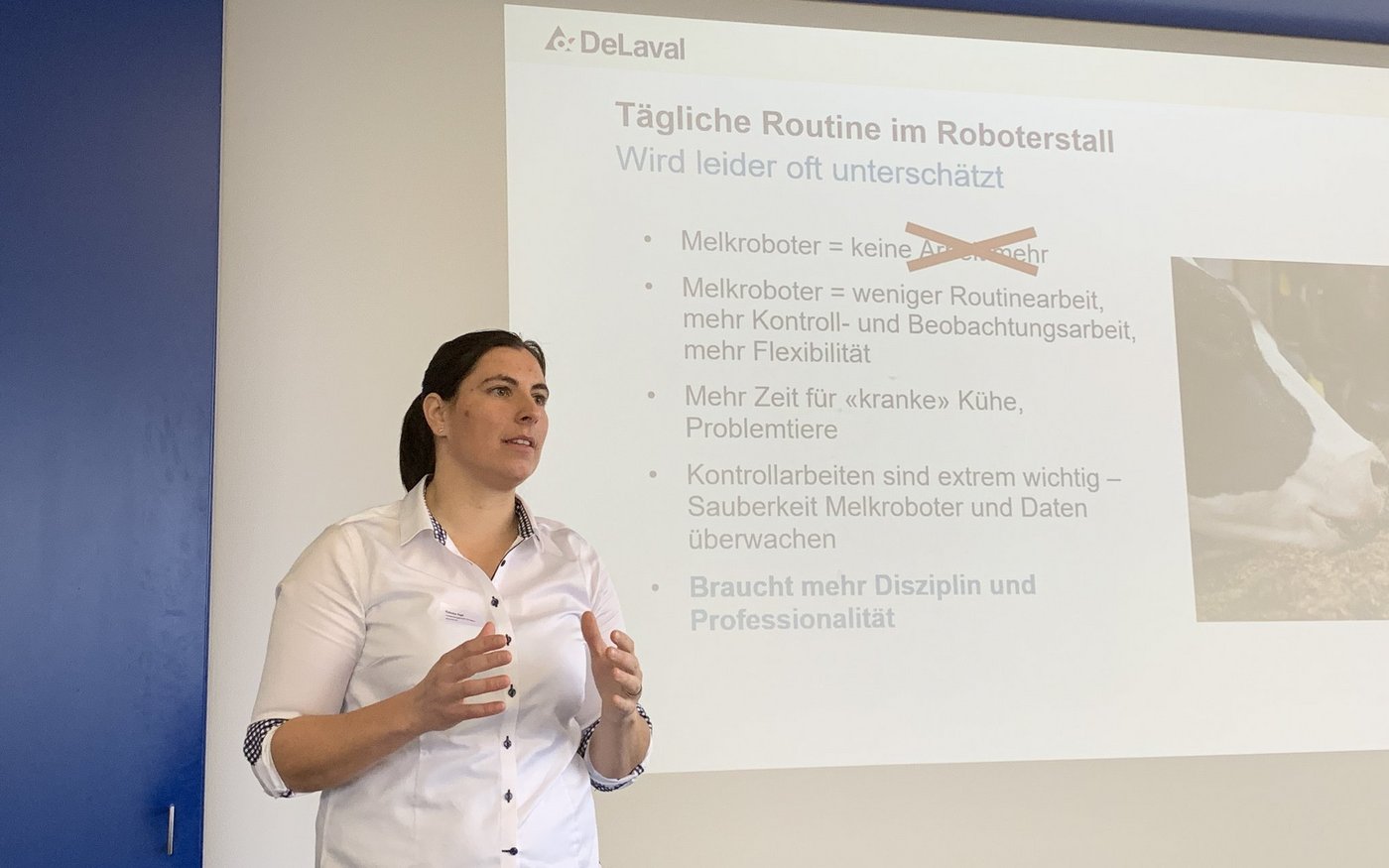 Grund genug für DeLaval, am Montag rund 35 Käser an ihren Schweizer Sitz nach Sursee LU einzuladen und in Theorie und Praxis zu informieren. Die Technik habe enorme Fortschritte gemacht, die heutigen Systeme seien ausgereift, würden aber auch hohe Ansprüche an den Service und die Betreuung durch die Landwirte stellen, meinte Schmid. Für die optimale Einführung und laufende Betreuung der Landwirte mit Melkrobotern bietet DeLaval die Herdenmanagementberatung an. Diesbezüglich wiesen Loic Sprunger und Rebeka Egli auf die vielen betriebsindividuellen Kriterien hin, die vor einem Entscheid für Melkroboter zu klären sind. So richtig eingespielt sei das System für Mensch und Tier erst nach mehreren Monaten.