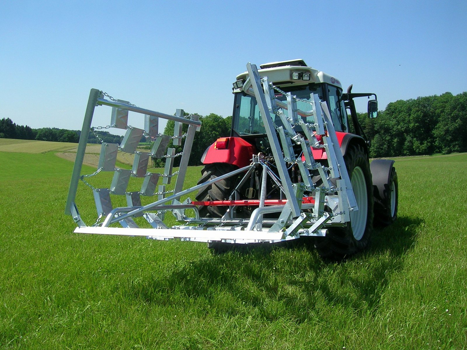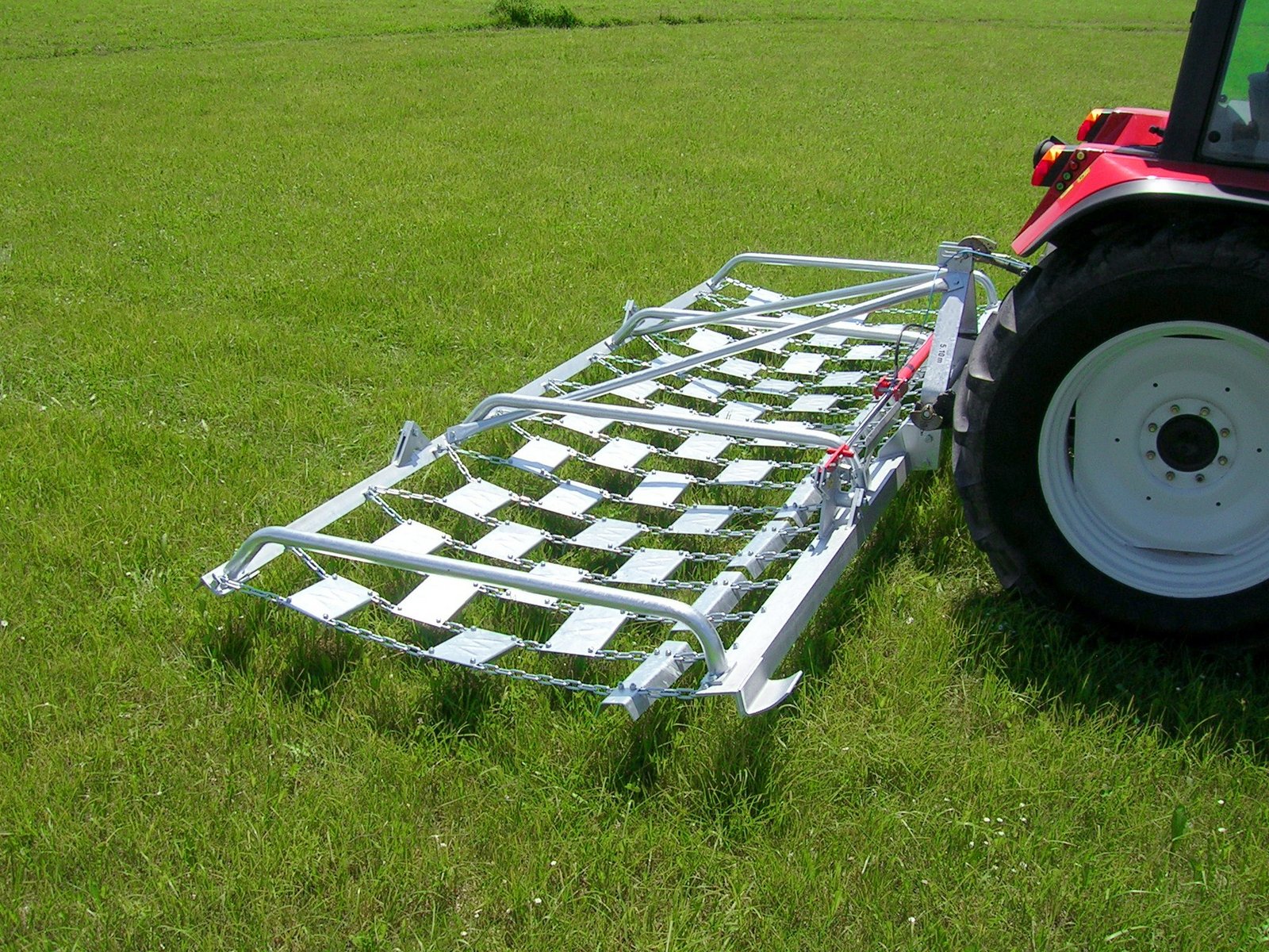 Die Wiesenegge von Wölfleder – made in Austria – wird aus verschleissfestem Stahl hergestellt und anschliessend feuerverzinkt. Auch die Verbindungs-ketten sind verzinkt und stark gehärtet, durch ein eigens patentiertes System sollen auch die Befestigungsstellen der Ketten verschleissfrei bleiben.
