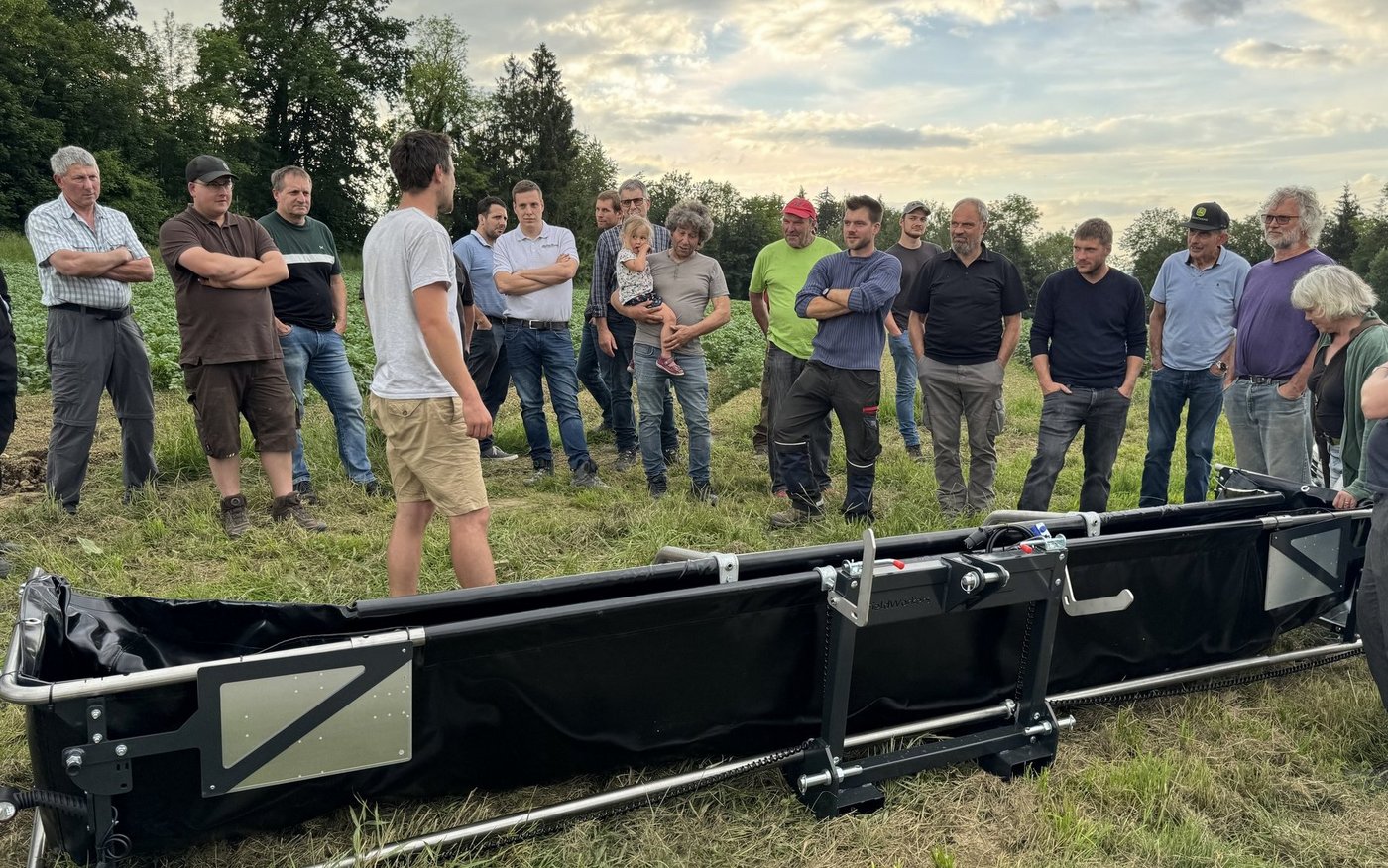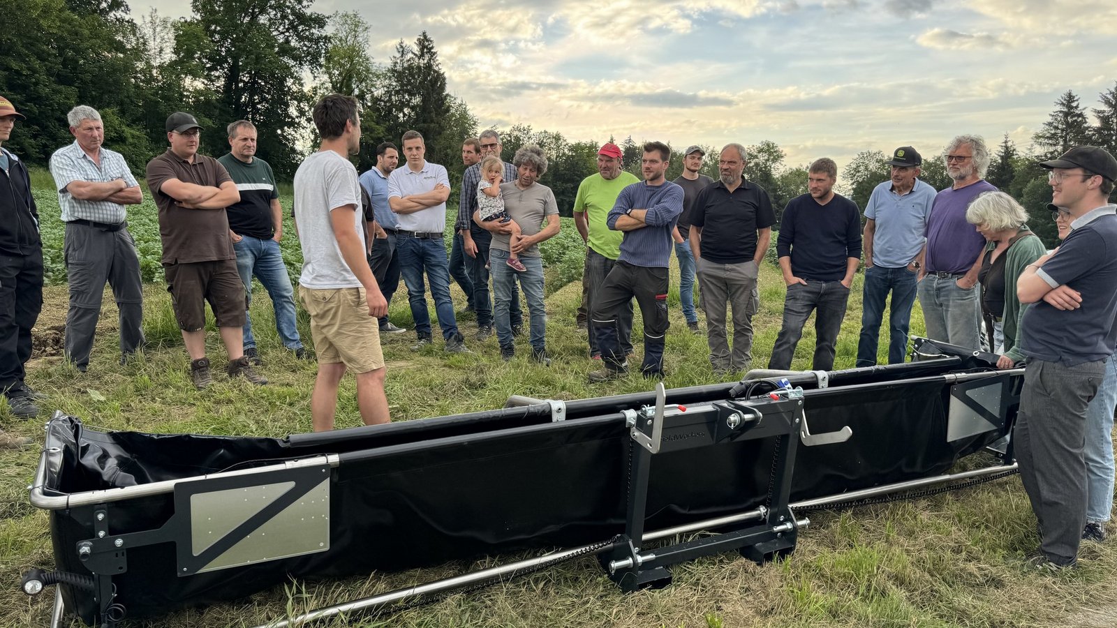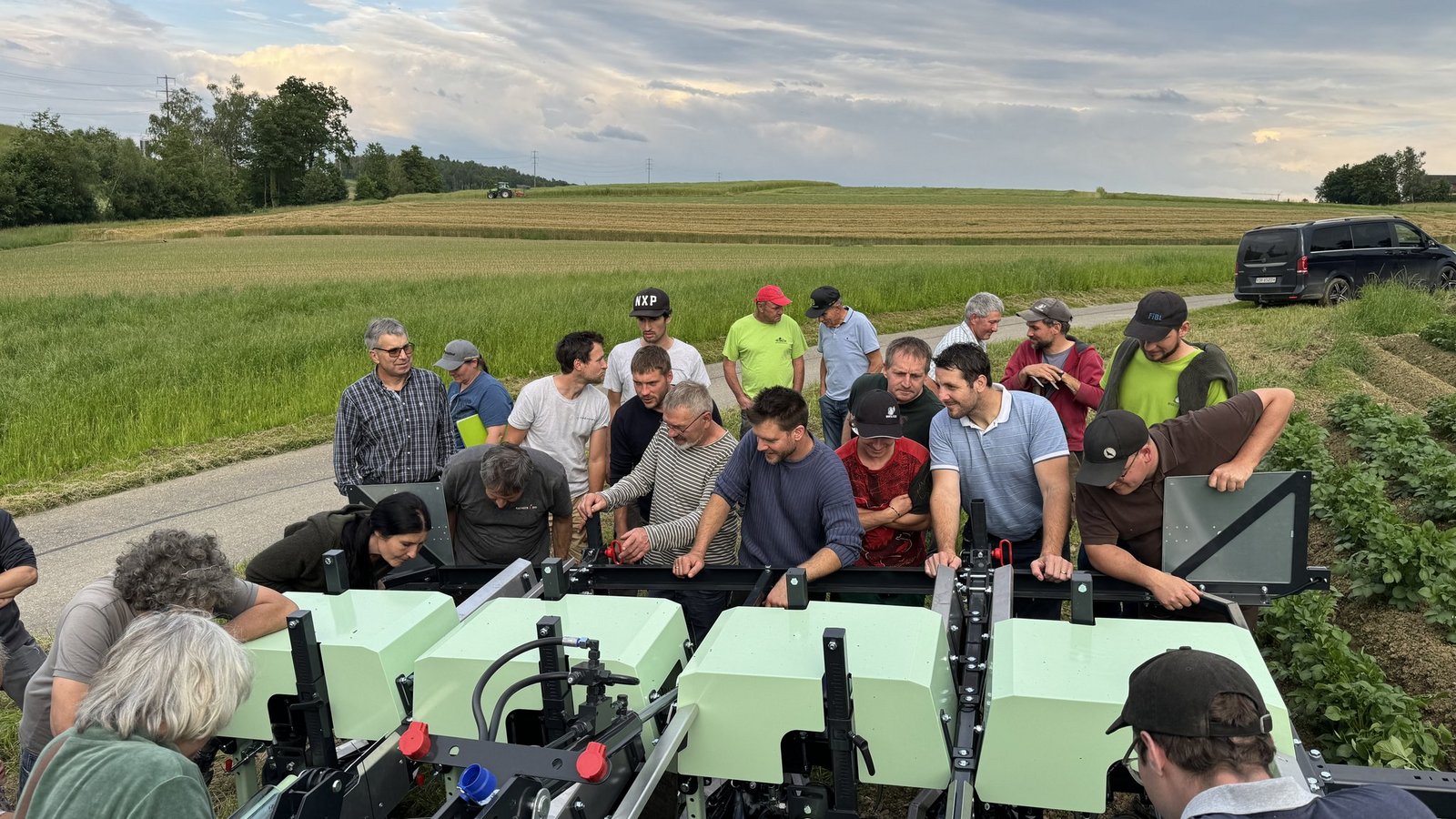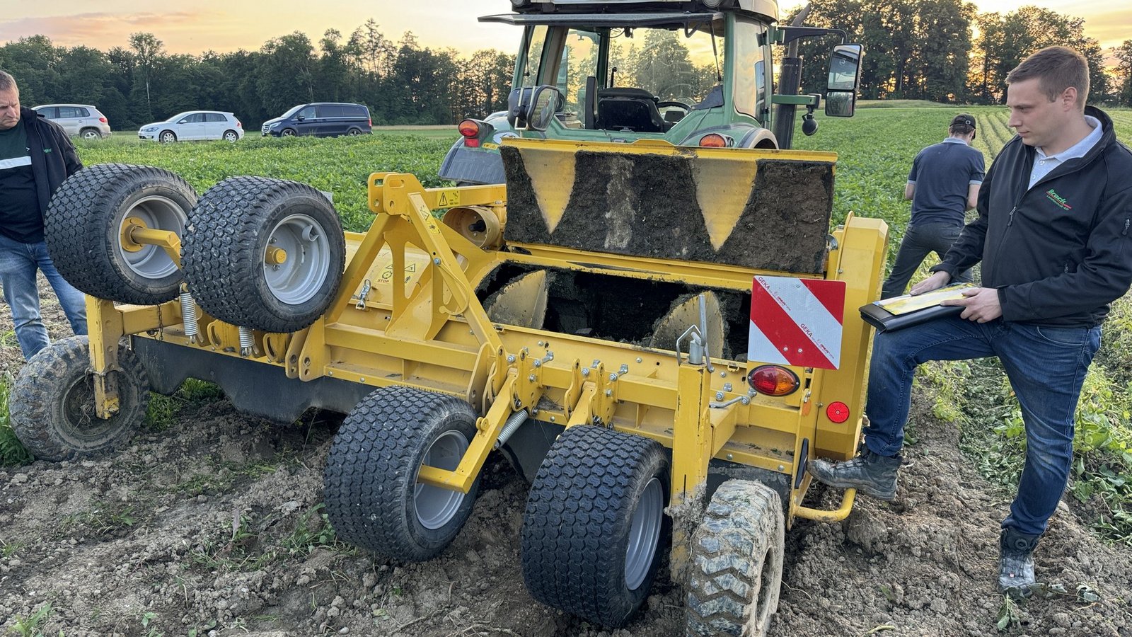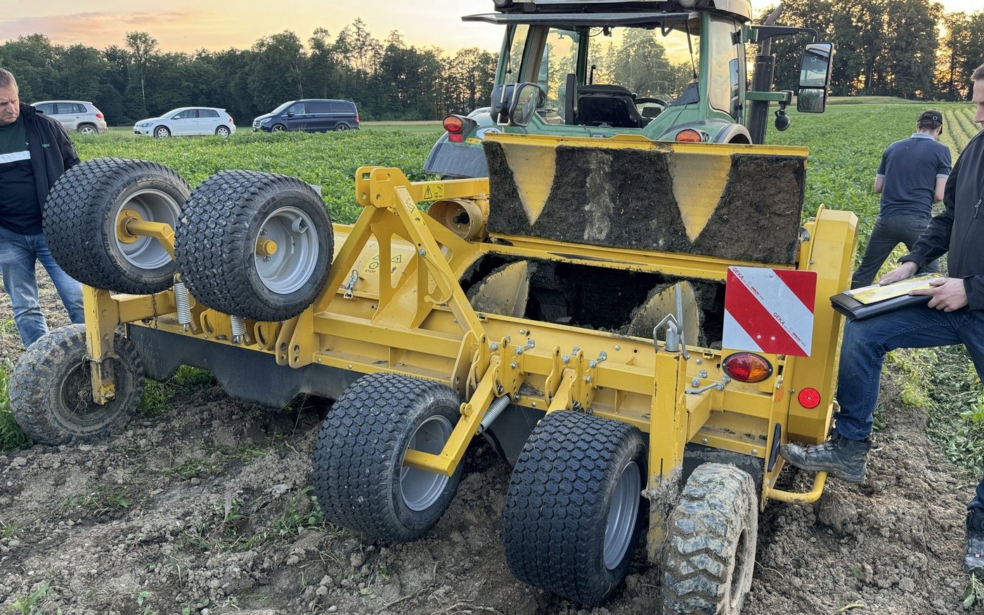 Die ersten Resultate sehen vielversprechend aus, am Flurgang selbst wurden zwar relativ wenig Käfer eingesammelt, dies lag jedoch am geringen Befalls-druck vor Ort. Tobias Gelencsér, Kartoffelberater und Co-Leiter Gruppe Anbautechnik Ackerbau vom Forschungsinstitut für biologischen Landbau (FiBL), stellte die positiven Versuchsresultate vor, welche man letztes Jahr mit der Maschine gesammelt hatte. Je nach Kartoffelsorte konnte man mit der Maschine bis zu 99 Prozent der Käfer von den Kartoffeln entfernen. Den Höchstwert habe man mit der sehr aufrechten Sorte Vitabella erzielt, tiefere, aber dennoch immer noch sehr gute Bekämpfungswerte gab es mit der deutlich buschigeren Sorte Venezia. Die besten Resultate ergaben Durchfahrten mit einer Fahrgeschwindigkeit von 2 km/h und 140 Lamellenrotor-Umdrehungen pro Minute.