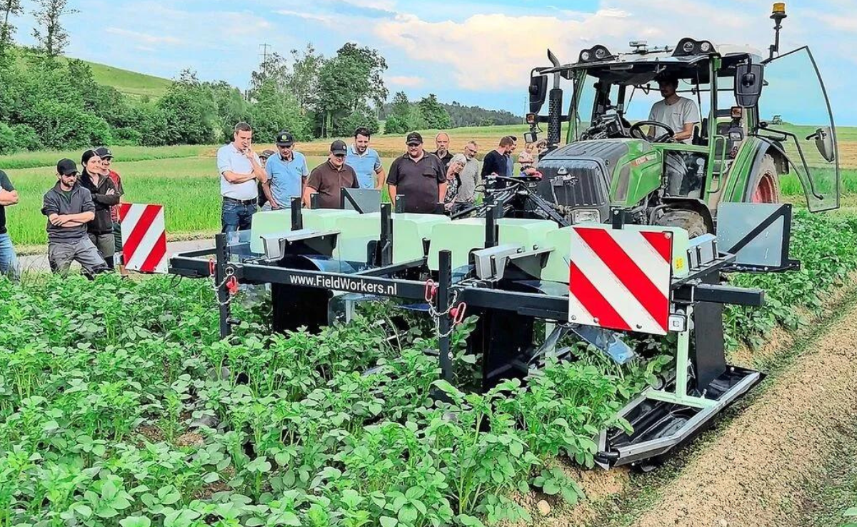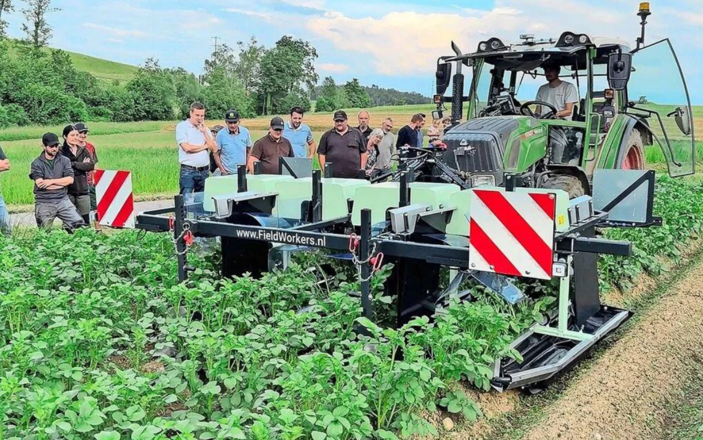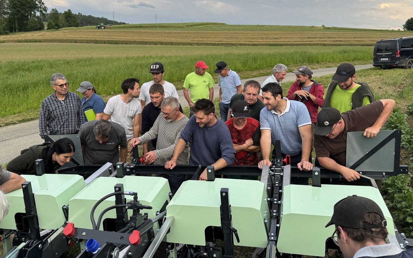 Die angereisten Landwirte staunten nicht schlecht, als der anwesende Erfinder und Konstrukteur der Maschine, Ard Klompe, mit dieser am Flurgang losfuhr und die Kartoffelpflanzen auf vier Dämmen damit «ohrfeigte». Er und Robin Kampert, Verkäufer bei Fieldworkers, standen den Landwirten anschliessend für Fragen zur Verfügung. Man habe viel Zeit in die Entwicklung der Maschine investiert, nun sei sie Serienreif und Verkaufsfähig, konstatierte Robin Kampert. Die am Flurgang gezeigte Maschine, werde bereits von einem Schweizer Landwirt eingesetzt, sie sei sehr flexibel gebaut und könne so zum Beispiel Dämme von 75 cm und 105 cm Breite bearbeiten.