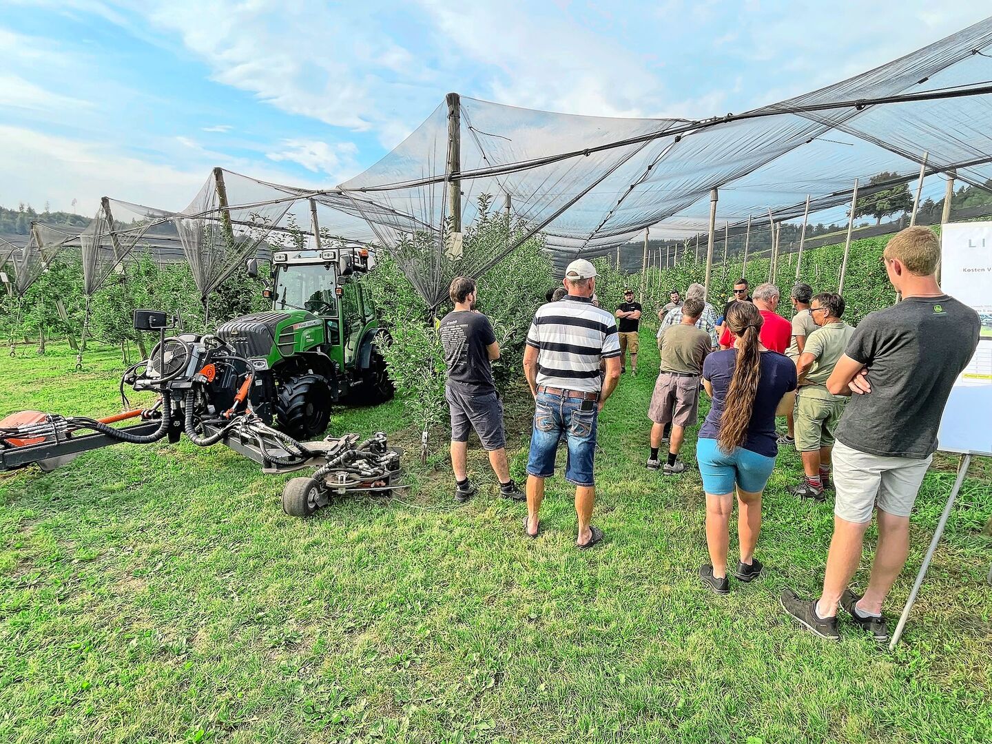 Estermann zeigte in der Anlage beim LZ Liebegg auch einen Krümler zur schonenden Bodenbearbeitung des Baumstreifens sowie einen Fadenmäher zur wirksamen Bekämpfung von Unkraut im Einsatz.